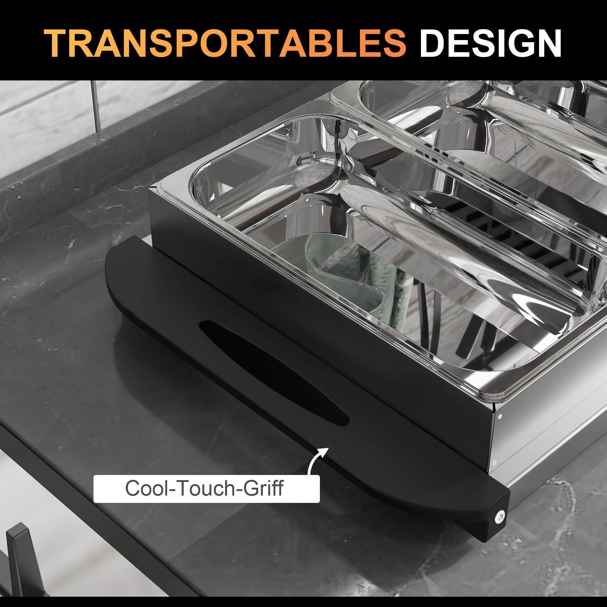 - Kühlbleibende Griffe: Dank der kühlbleibenden Griffe lässt sich dieser elektrische Speisenwärmer sicher und einfach transportieren, ohne Verbrennungsgefahr,