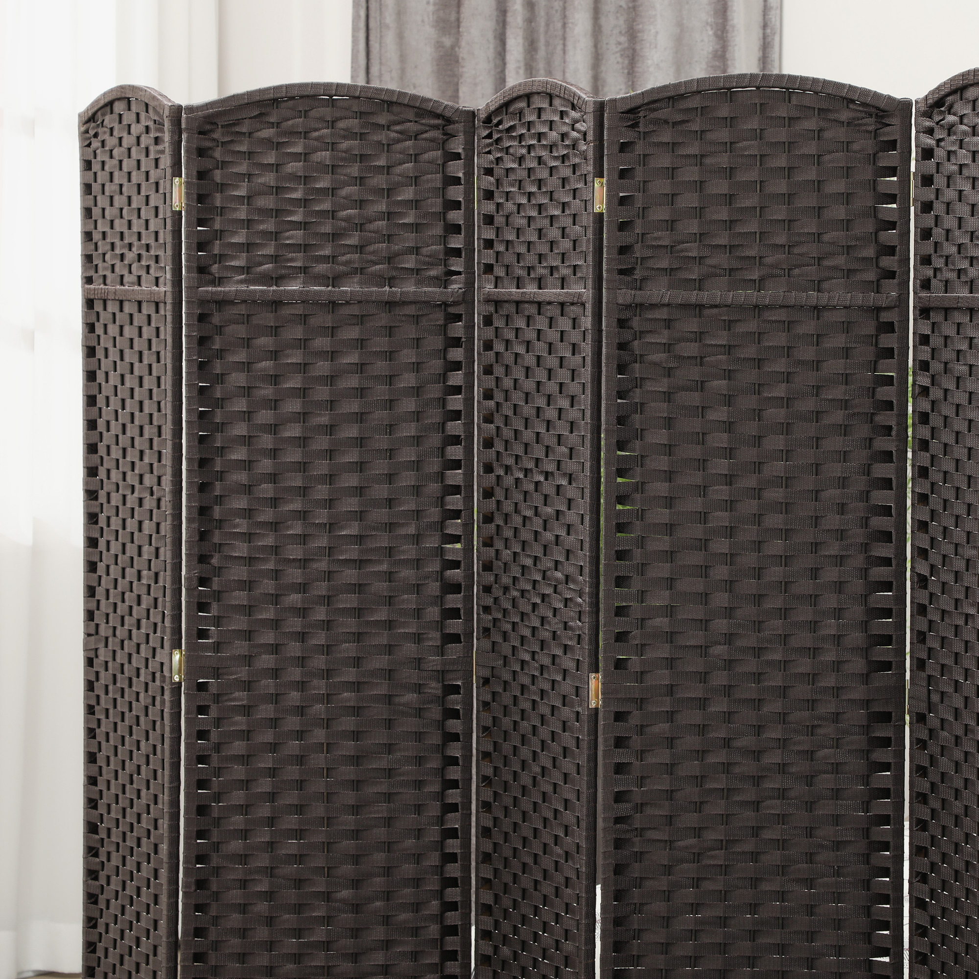 Gestalten Sie Ihre Räumlichkeiten neu mit dem Raumteiler von HOMCOM, Das Polypropylen-Material gewährleistet mehr Privatsphäre und Haltbarkeit als herkömmliche Papierfasern, Die mobile Trennwand kombiniert Stil und Funktionalität mit einem eleganten, sechsteiligen Falt-Design und 15 Metallscharnieren, Der geschwungene Rahmen aus Kiefernholz und das Polypropylen-Gewebe verleihen diesem faltbaren Paravent eine elegante Note,