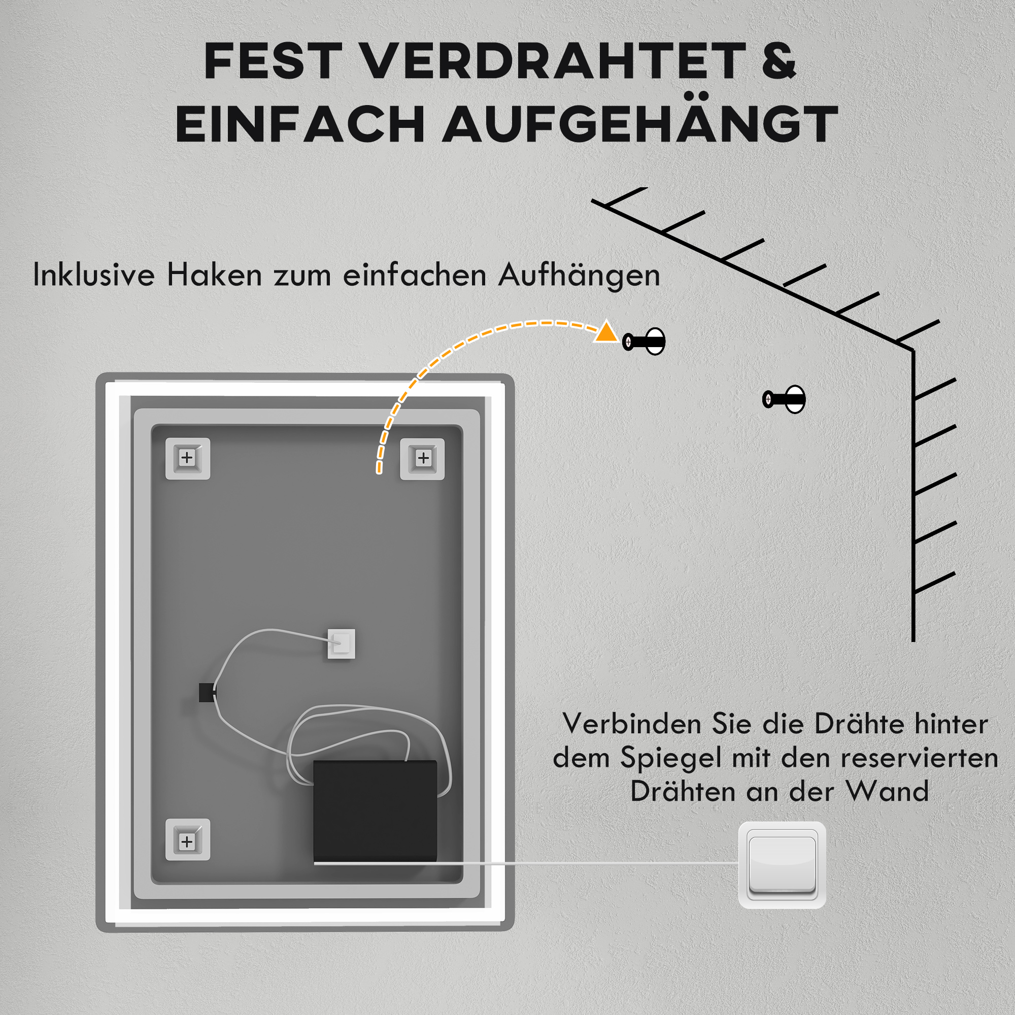 - Einfache Installation: Der beleuchtete Badezimmerspiegel ist mit dem mitgelieferten Montagematerial einfach zu installieren, Er verfügt über eingebaute Haken für eine sichere Aufhängung (vertikal oder horizontal) und kann mit einer festverdrahteten Verbindung installiert werden