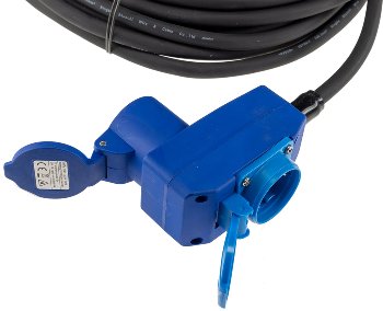 Ideal für Camping, Caravaning und Wohnwagen: Schwere Gummischlauchleitung mit CEE-Stecker und CEE-Winkel-Kupplung mit integrierter Schutzkontakt-Steckdose.