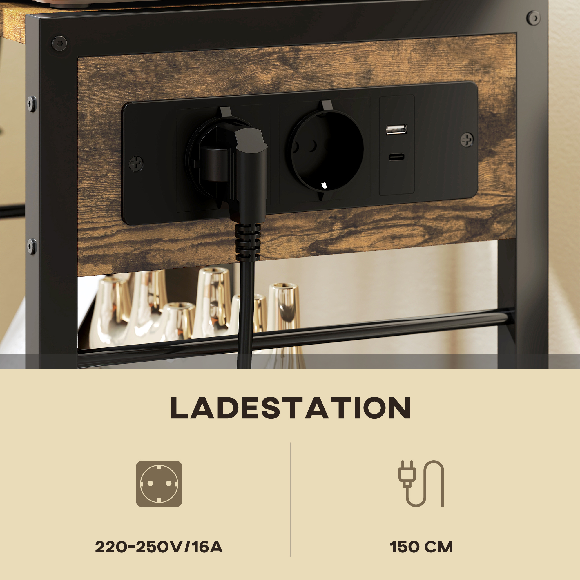 - - Die Ladestation des Druckeregals umfasst 2 EU-Steckdosen sowie USB- und USB-C-Anschlüsse