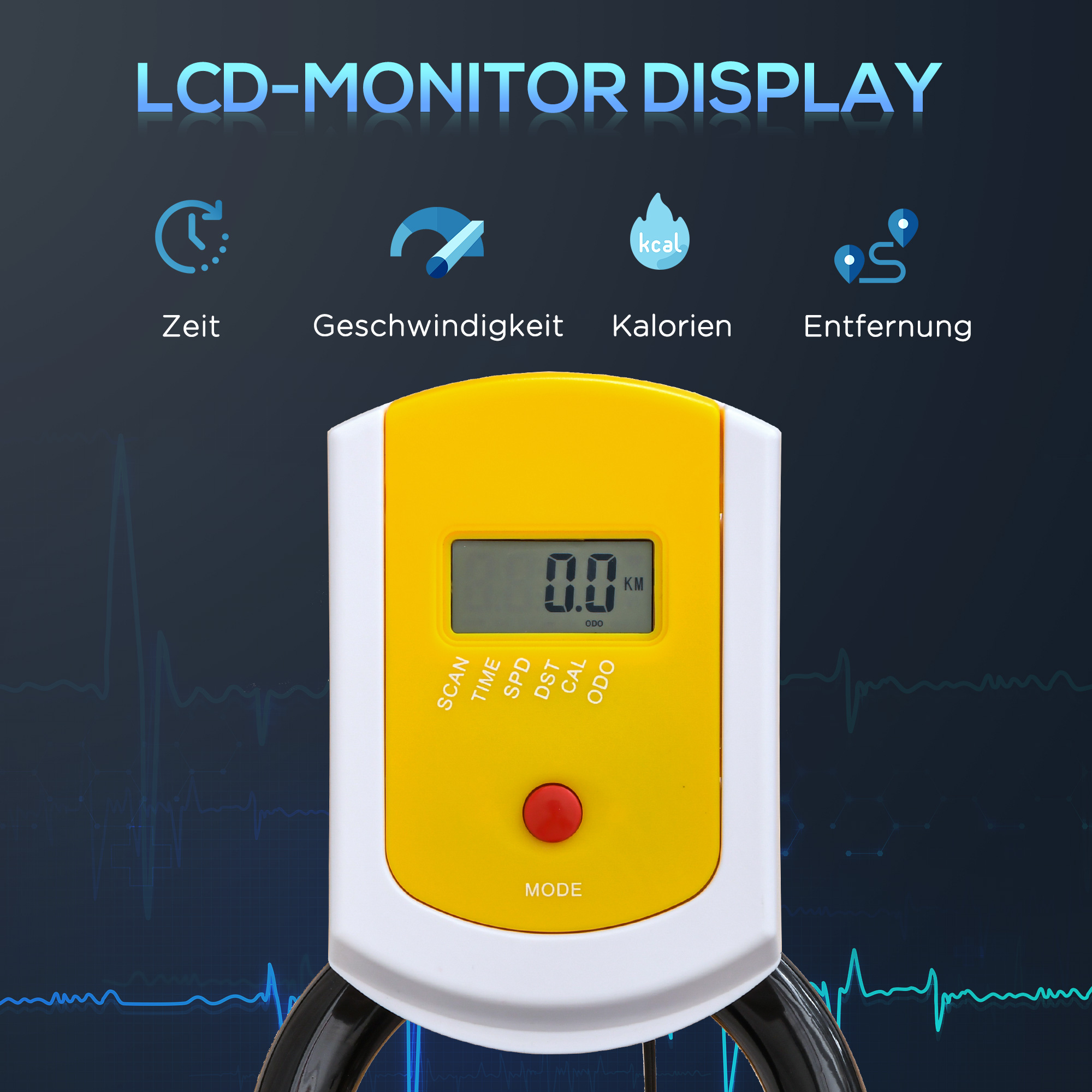 - LCD-Monitoranzeige: Die LCD-Monitoranzeige zeigt ihre Fitnessstatistiken an wie zum Beispiel, Die Geschwindigkeit, Distanz, Zeit und den Kalorienverbrauch,