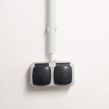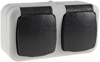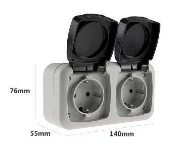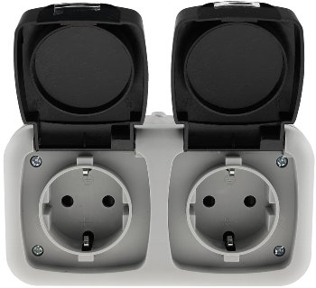 Spritzwassergeschützte Doppel-Steckdose in Aufputz-Ausführung für 250V/50Hz, max. 16A. Hellgrauer Rahmen mit dunkelgrauem Deckel mit Federschließung.