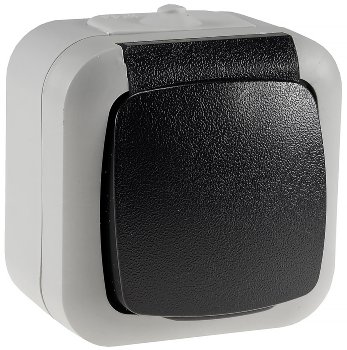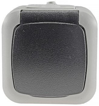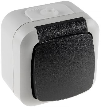 Spritzwassergeschützte Steckdose in Aufputz-Ausführung für 250V/50Hz, max. 16A. Hellgrauer Rahmen mit dunkelgrauem Deckel mit Federschließung.