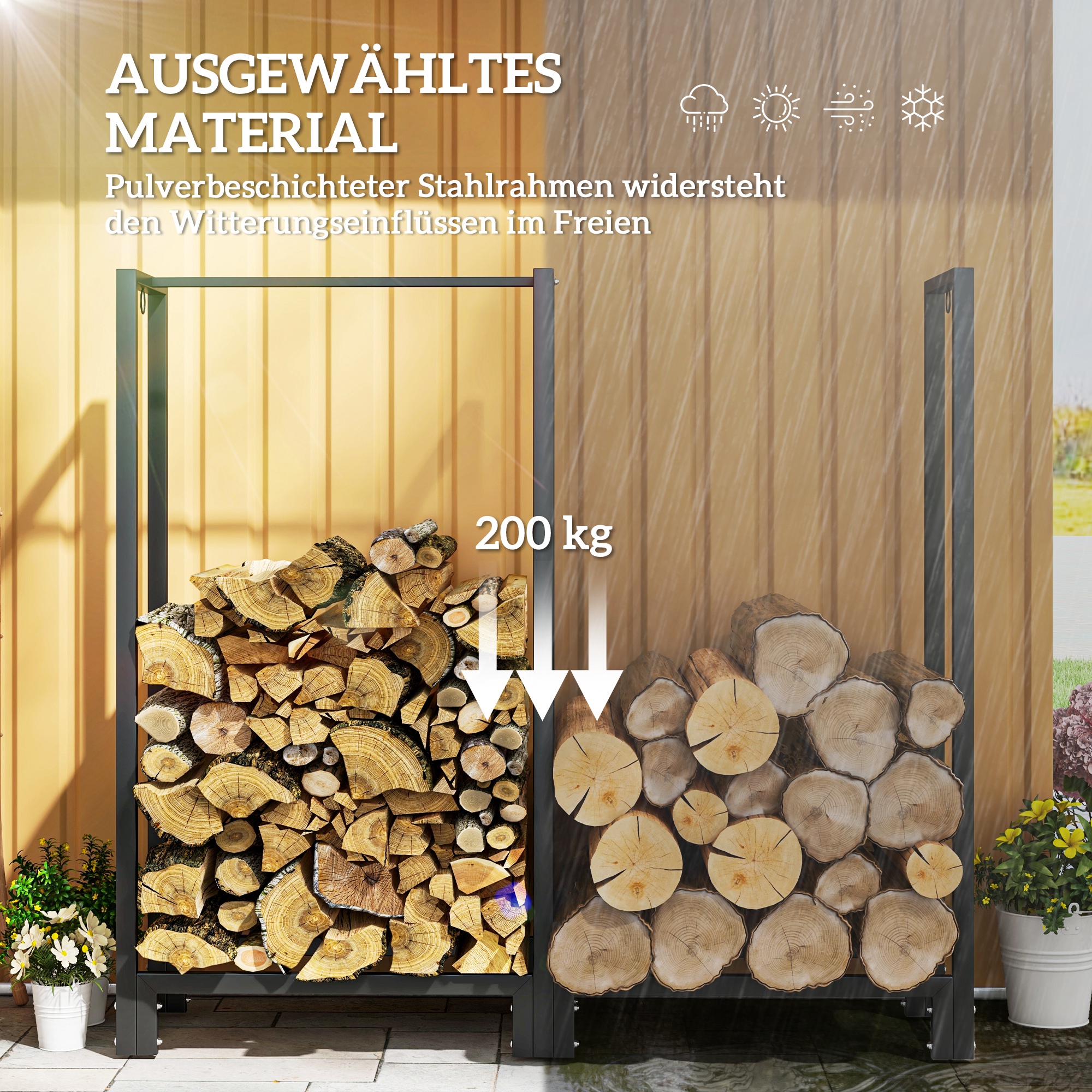 Organisieren und schützen Sie Ihr Brennholz stilvoll mit dem Outsunny Brennholzregal! Es verfügt über ein innovatives Design mit zwei Bereichen, um kleinere und größere Holzscheite sowie Anzündholz zu trennen, Der robuste Rahmen des Kaminholzregals aus pulverbeschichtetem Stahl kann bis zu 200 kg tragen, Drei Sicherheitsringe und sechs stabile Beine des Kaminholzregals verhindern das Kippen, während die erhöhte Basis das Holz trocken hält und zum Anfeuern bereit ist,