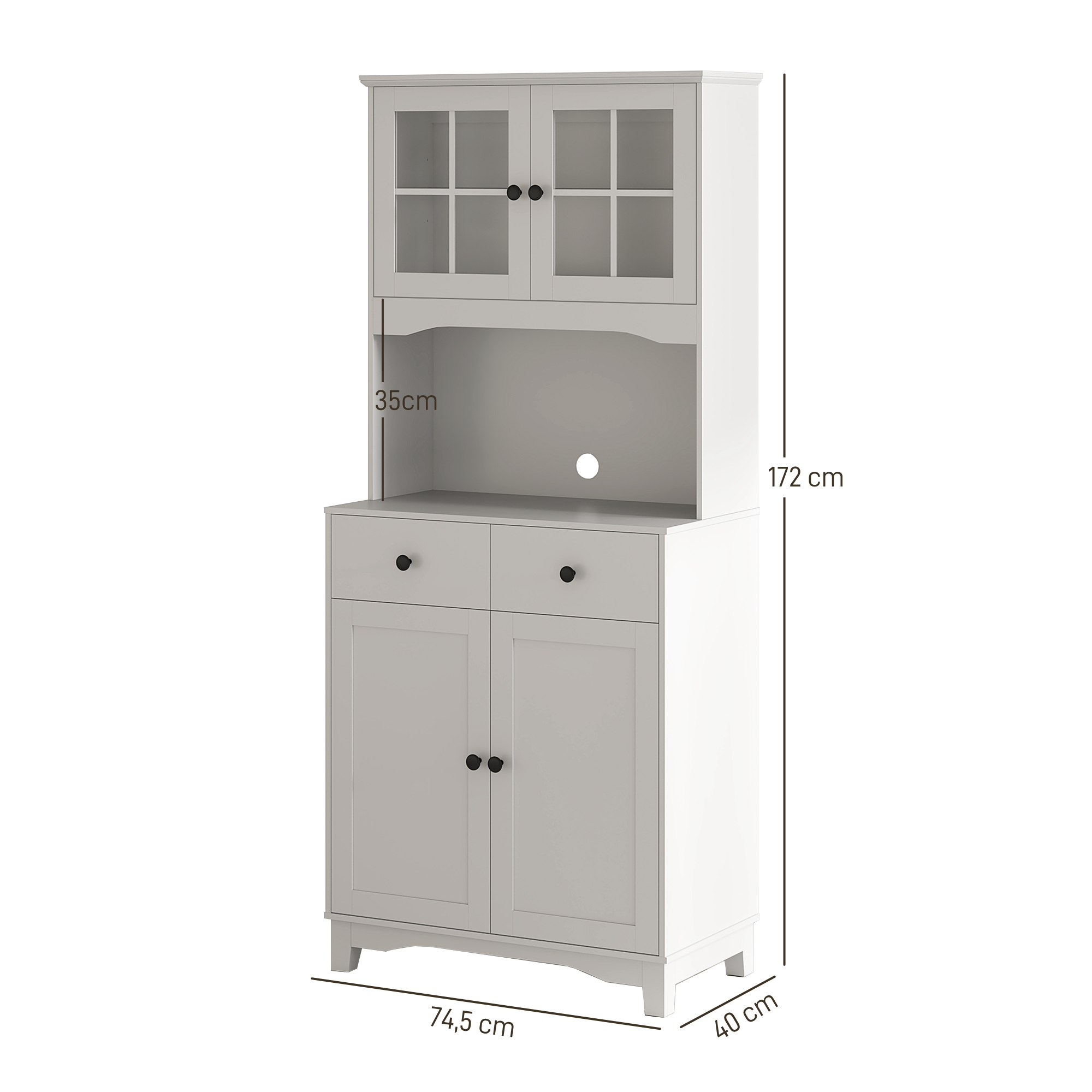 Mit dem HOMCOM Vitrinenschrank schaffen Sie übersichtliche Ordnung, Dieser geräumige Flurschrank verfügt über zwei Doppeltürschränke und zwei Schubladen, was die Organisation Ihrer Küchenutensilien erleichtert, Auf der großen Arbeitsplatte finden Mikrowelle oder Kaffeemaschine Platz und eine nützliche Öffnung für Stromkabel gibt es außerdem, Auch die Höhe der Regale kann individuell angepasst werden!
