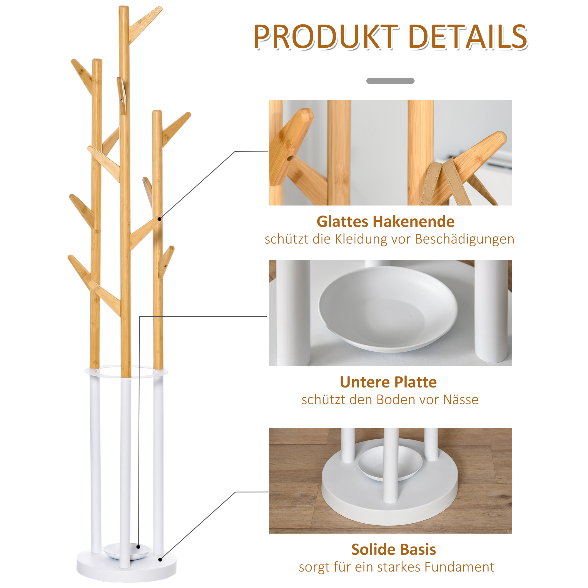 Produktinformationen "Garderobenständer, Kleiderständer mit 12 Haken und Schirmständer, Garderobe in Baumform, moderner Jackenständer für Kleidung, Hut, Tasche, für Wohnzimmer, Schlafzimmer, Bambus, Natur+Weiß"