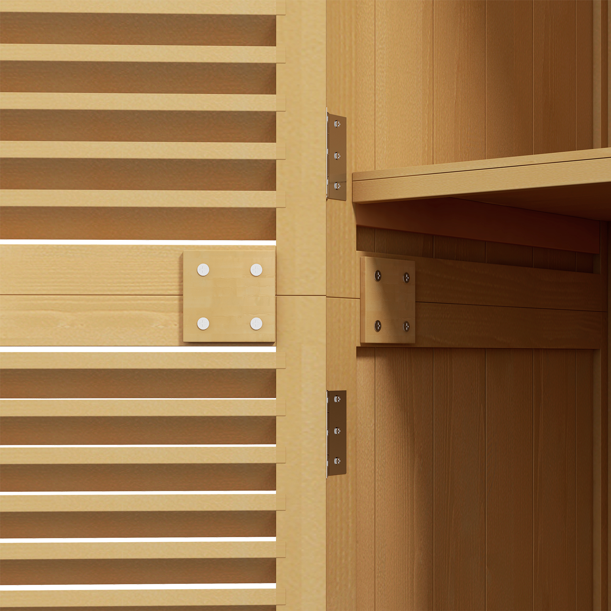 - Elegantes Design: Dieser stilvolle Geräteschuppen besticht durch seine eleganten Lamellentüren und das ansprechende Design, das sich harmonisch in jeden Garten einfügt,