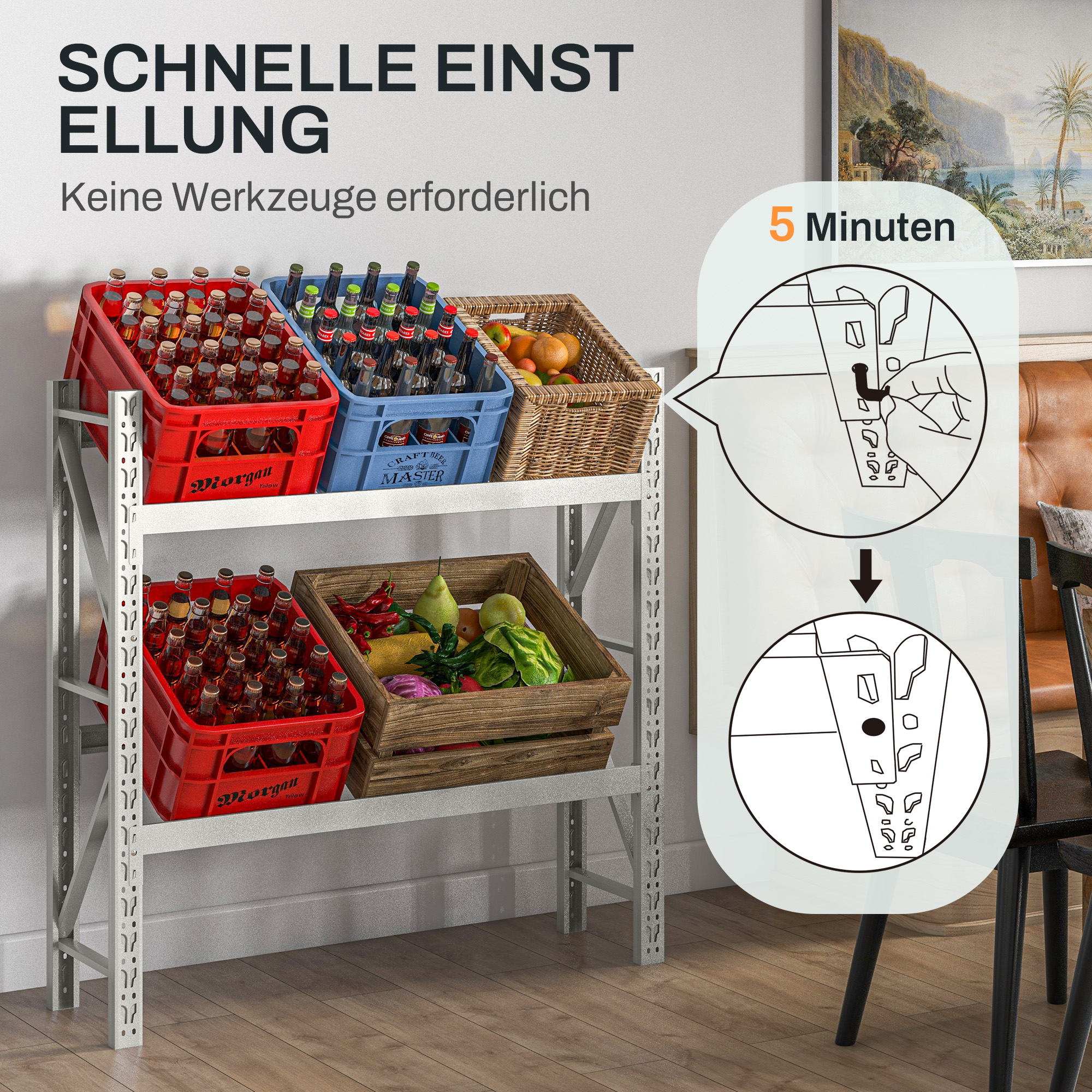 Entdecken Sie die einfache Art der Organisation mit dem HOMCOM Regal für Getränkekisten! Dieser zweistufige Kistenständer bietet Platz für bis zu 6 Getränkekisten und sorgt dafür, dass Ihre Getränke stets griffbereit sind, ganz ohne Bücken, Doch das ist nicht alles: Versetzen Sie das Regal, um Obst, Gemüse oder sogar Wäschekörbe zu verstauen, Eine clevere und vielseitige Lösung, um Ihren Raum sauber und ordentlich zu halten!