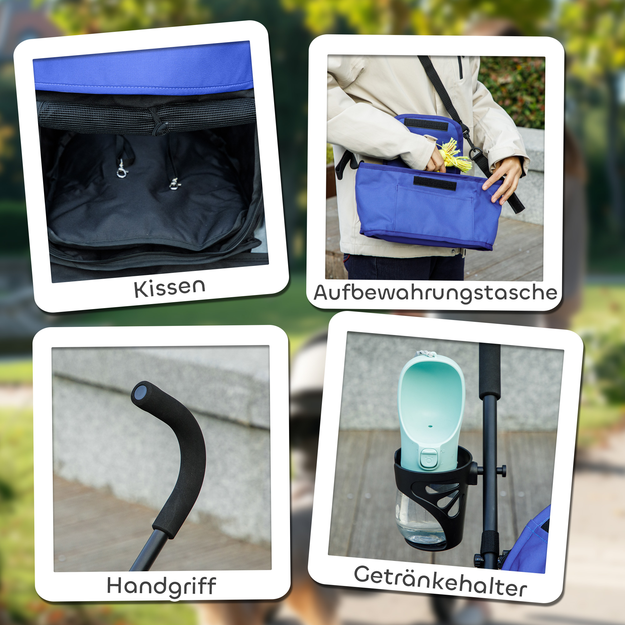 • Mehr Bequemlichkeit für Sie: Ausgestattet mit einem Becherhalter für Ihren Kaffee oder Ihr Wasser sowie einer Aufbewahrungstasche für Spielzeug, Snacks oder sonstiges Zubehör, das Ihr Haustier benötigt, Ideal für entspannte Spaziergänge, Erledigungen oder den Besuch beim Tierarzt,