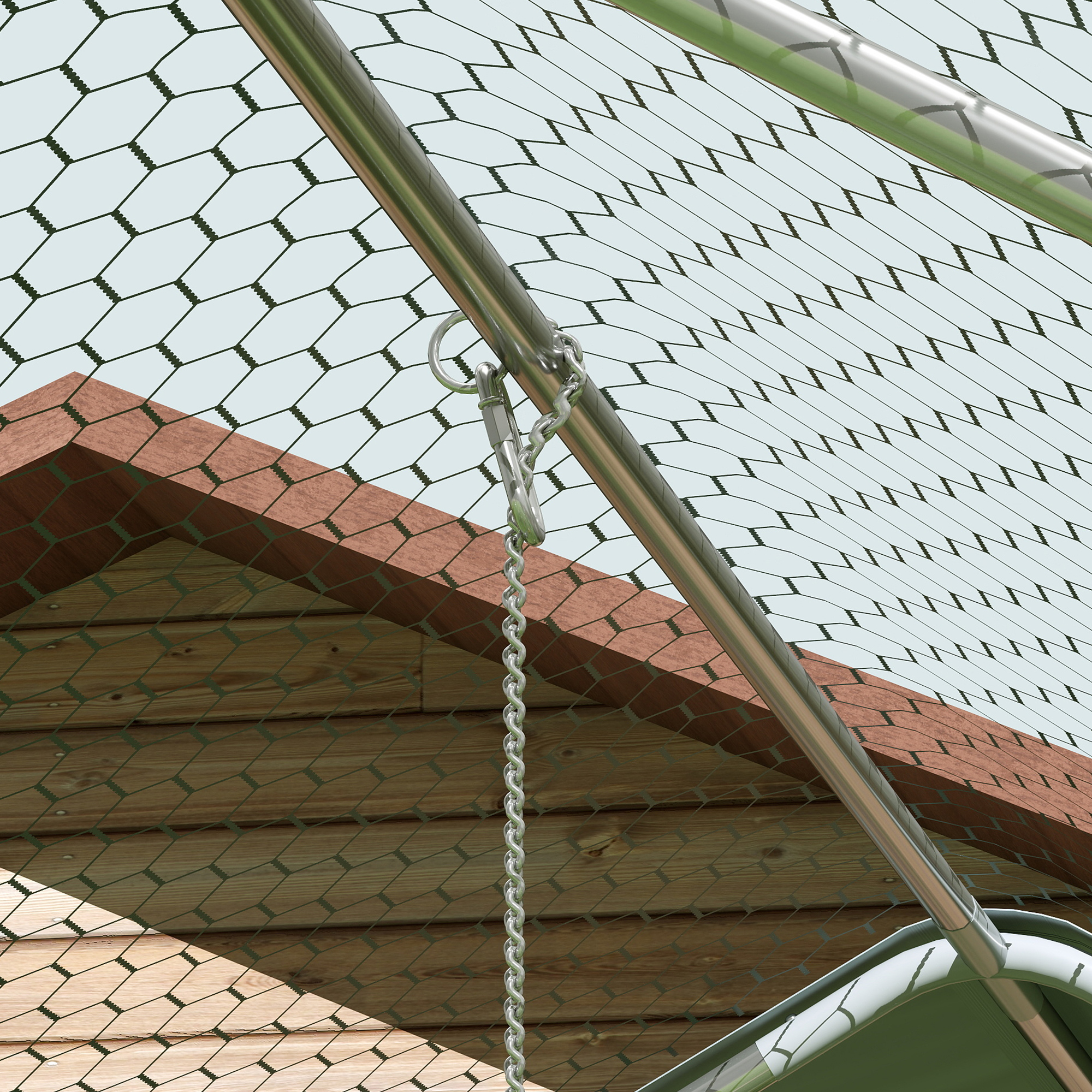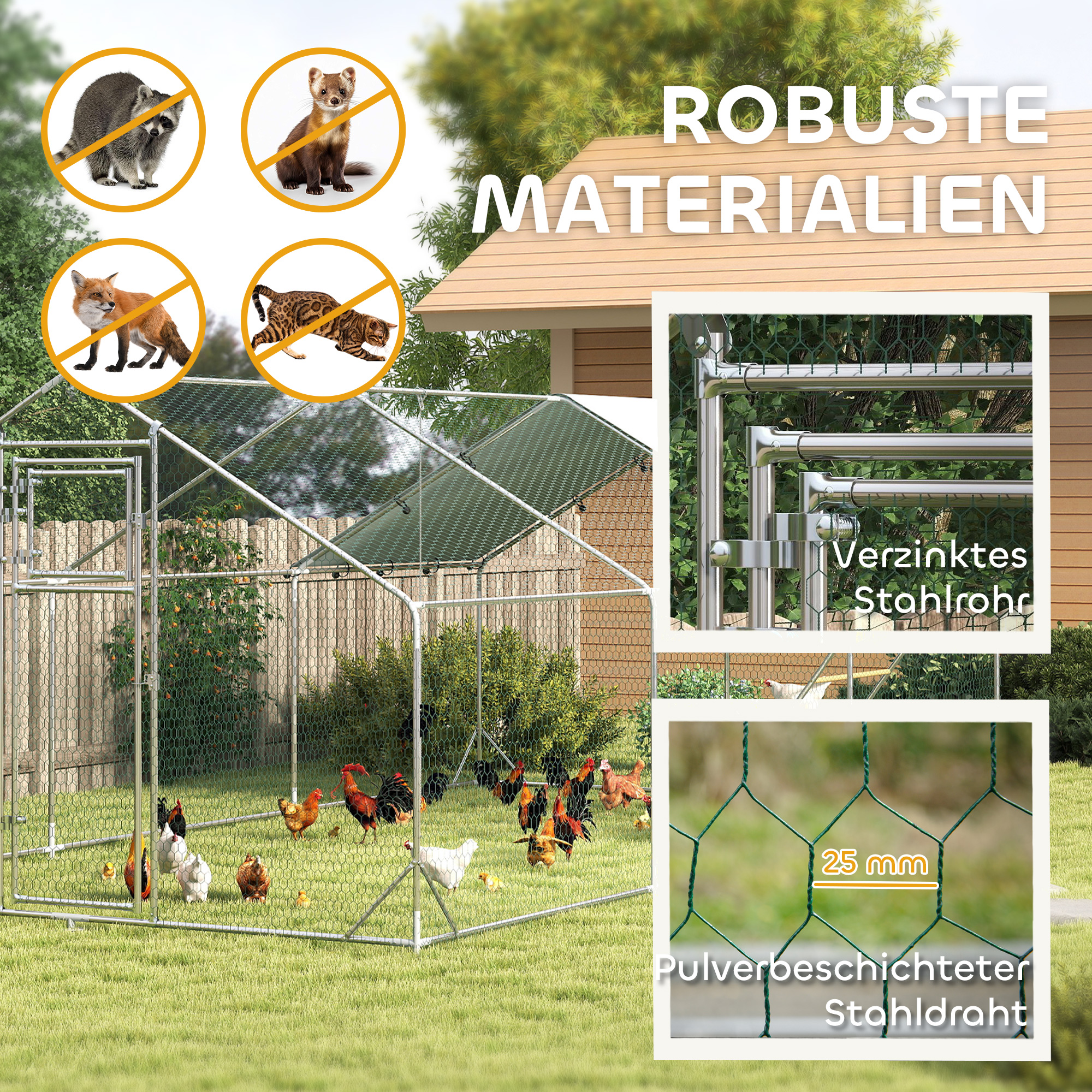 - - Verzinkter Stahl und kunststoffbeschichtetes Netz des Hühnergeheges gewährleisten Langlebigkeit