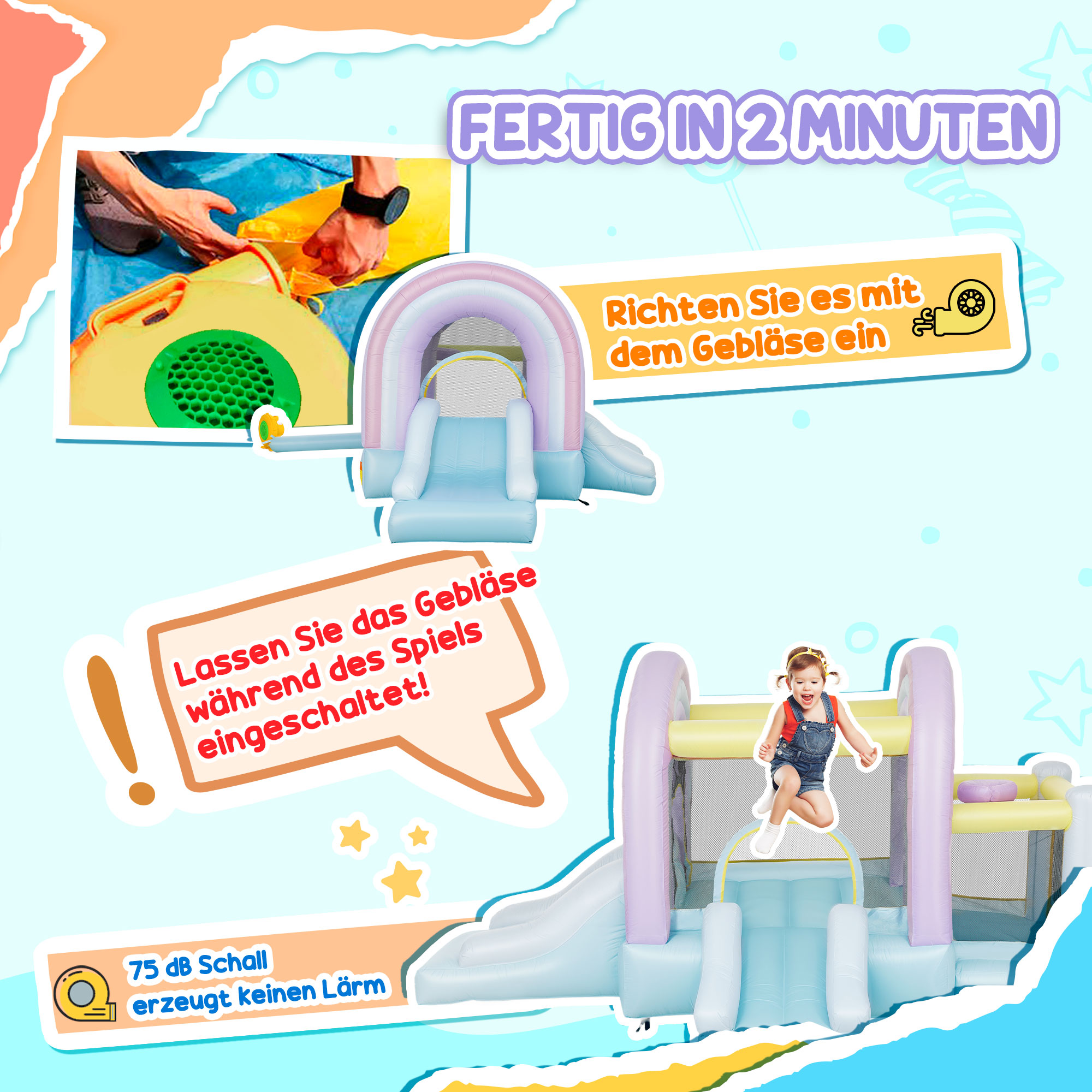 - Schneller Aufbau: Mit einem sicherheitskonformen Gebläse ausgestattet, bläst sich die Hüpfburg in nur 2 Minuten auf, sodass der Spielspaß nahezu ohne Verzögerung starten kann,