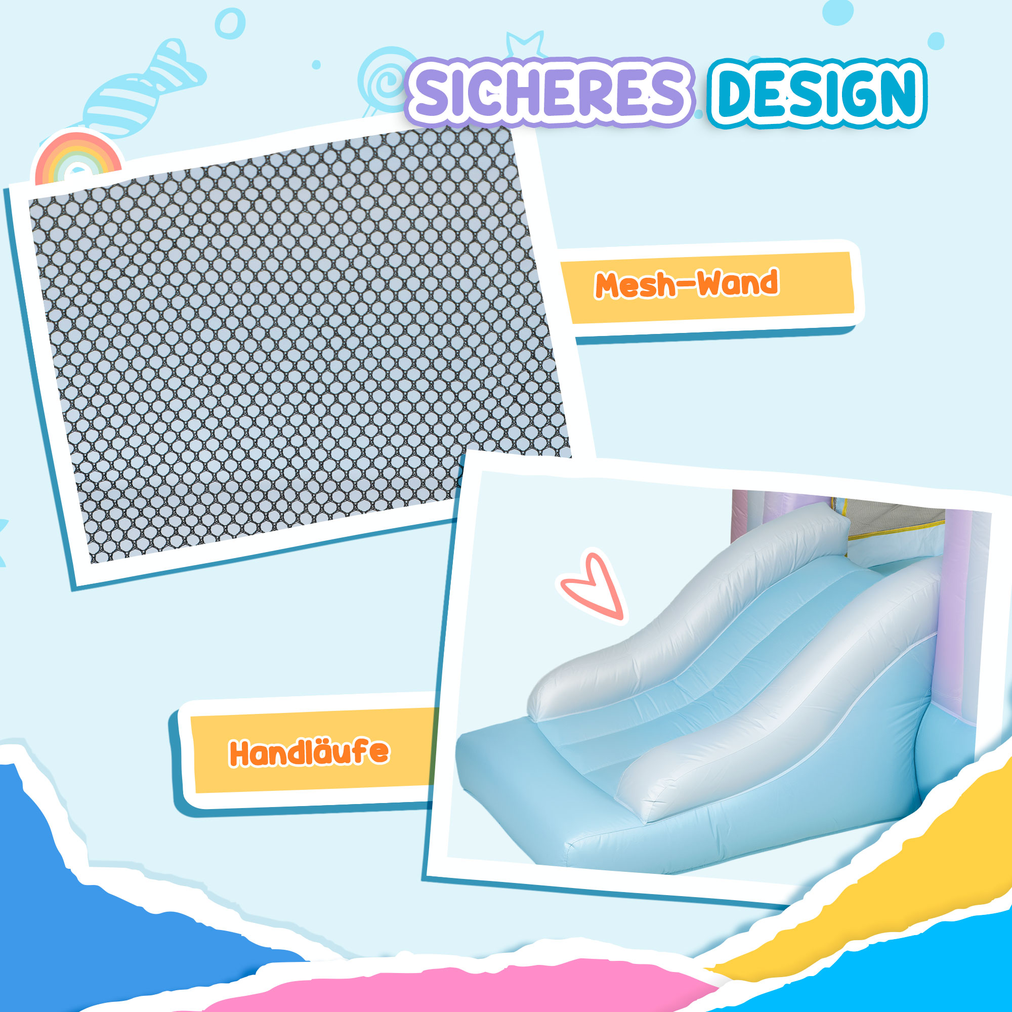 - Sicher und stabil: Mit einem Sicherheitsnetz rund um den Sprungbereich und Handläufen an der Rutsche ausgestattet, bietet sie zusätzliche Sicherheit; sechs Bodenanker sorgen dafür, dass die Burg auch bei Benutzung stabil bleibt,