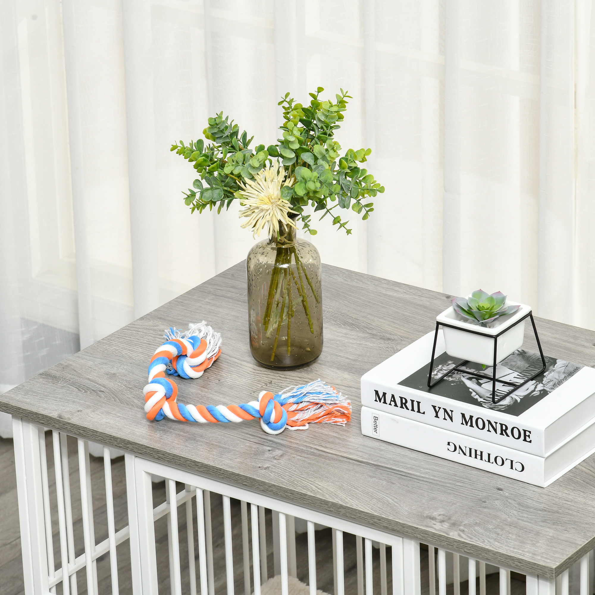 Hundekäfig aus Holz, Hundebox, Transportbox, mit Kissen, 86 cm x 60 cm x 70 cm Holzwerkstoff Stahl Weiß + Grau
