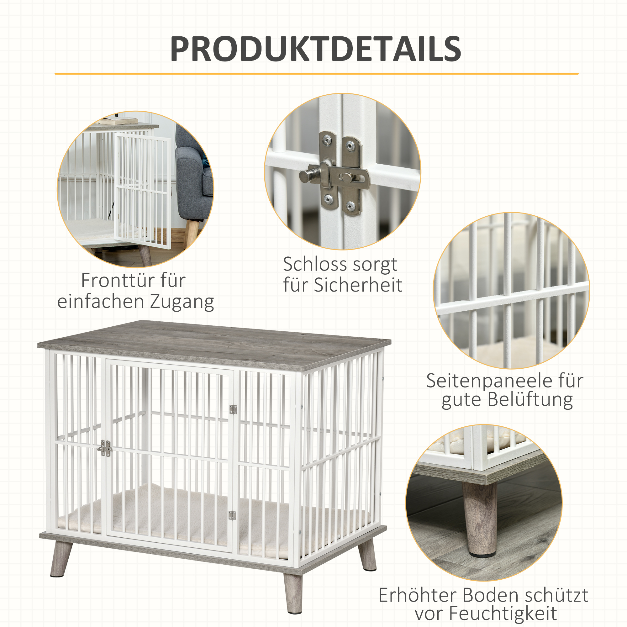 - Hundekäfig aus Holz: Eine solide Konstruktion aus Holzwerkstoff und Stahl, Die Gitterstäbe ermöglichen eine gute Belüftung im Inneren,