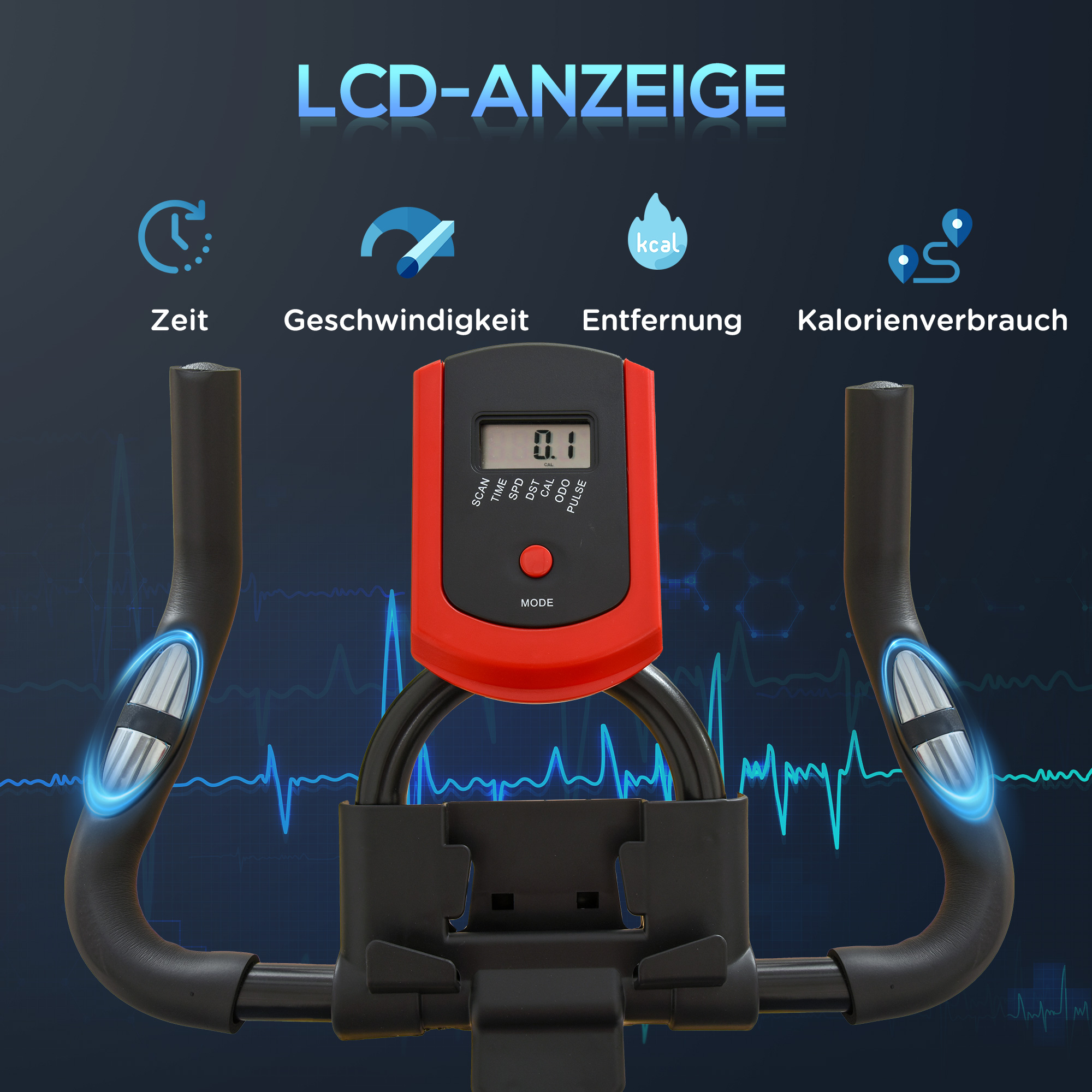 - - LCD-Display zeigt Trainingsdaten wie Zeit, Geschwindigkeit, Distanz und Kalorienverbrauch