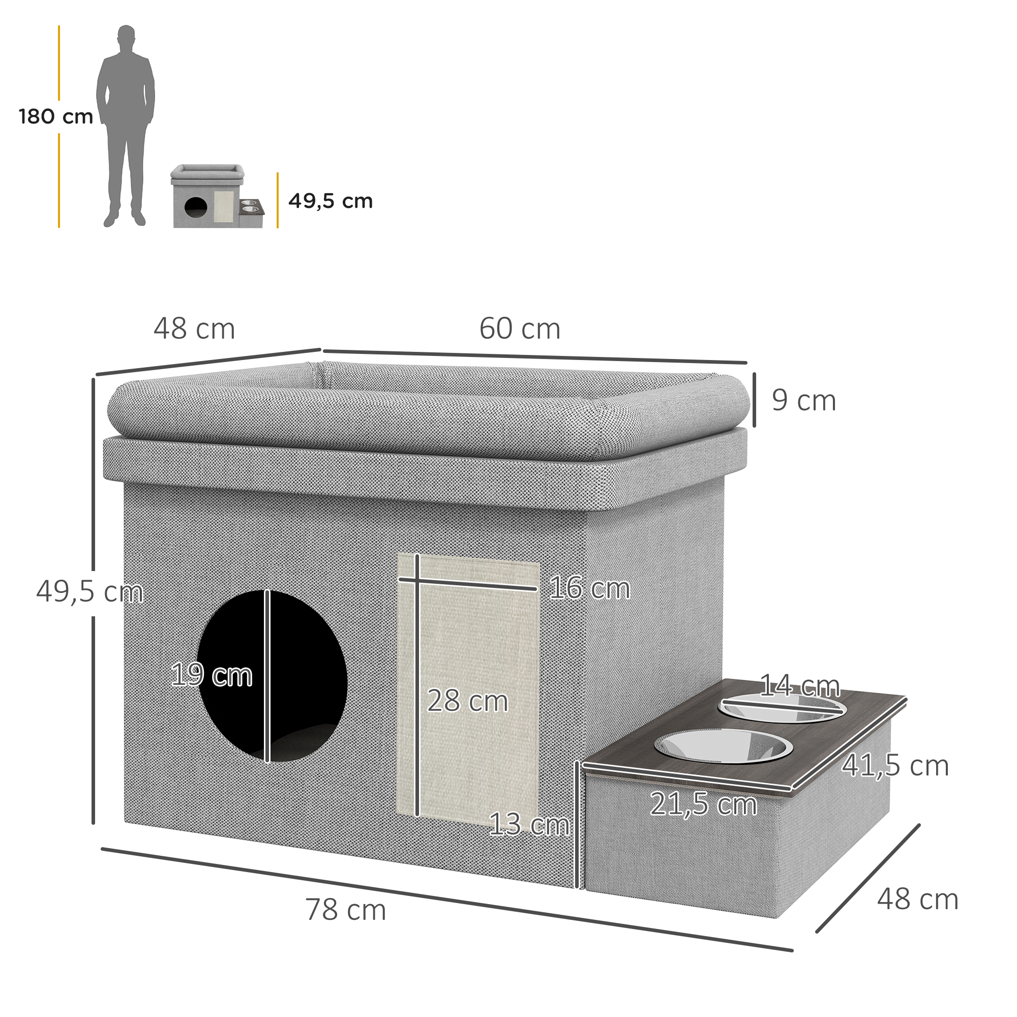 Katzenhaus, Futterplatz mit 2 Edelstahlnäpfen, Kratzmatte, weiches Liegekissen, 78 x 48 x 49,5 cm, grau