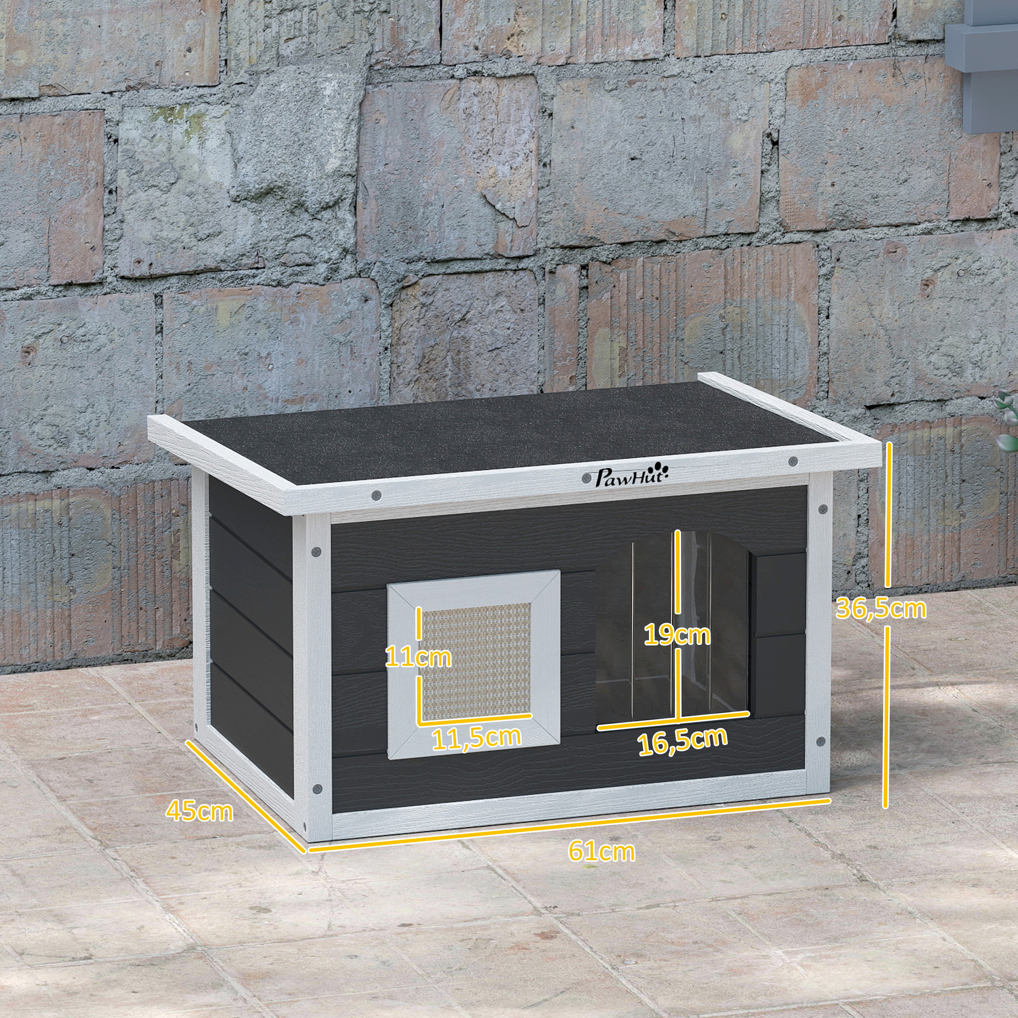Katzenhaus, Rückzugsort für Katzen und Kaninchen, Holzhaus mit Kratzmatte, Türklappe, 61 x 45 x 36,5 cm, Grau