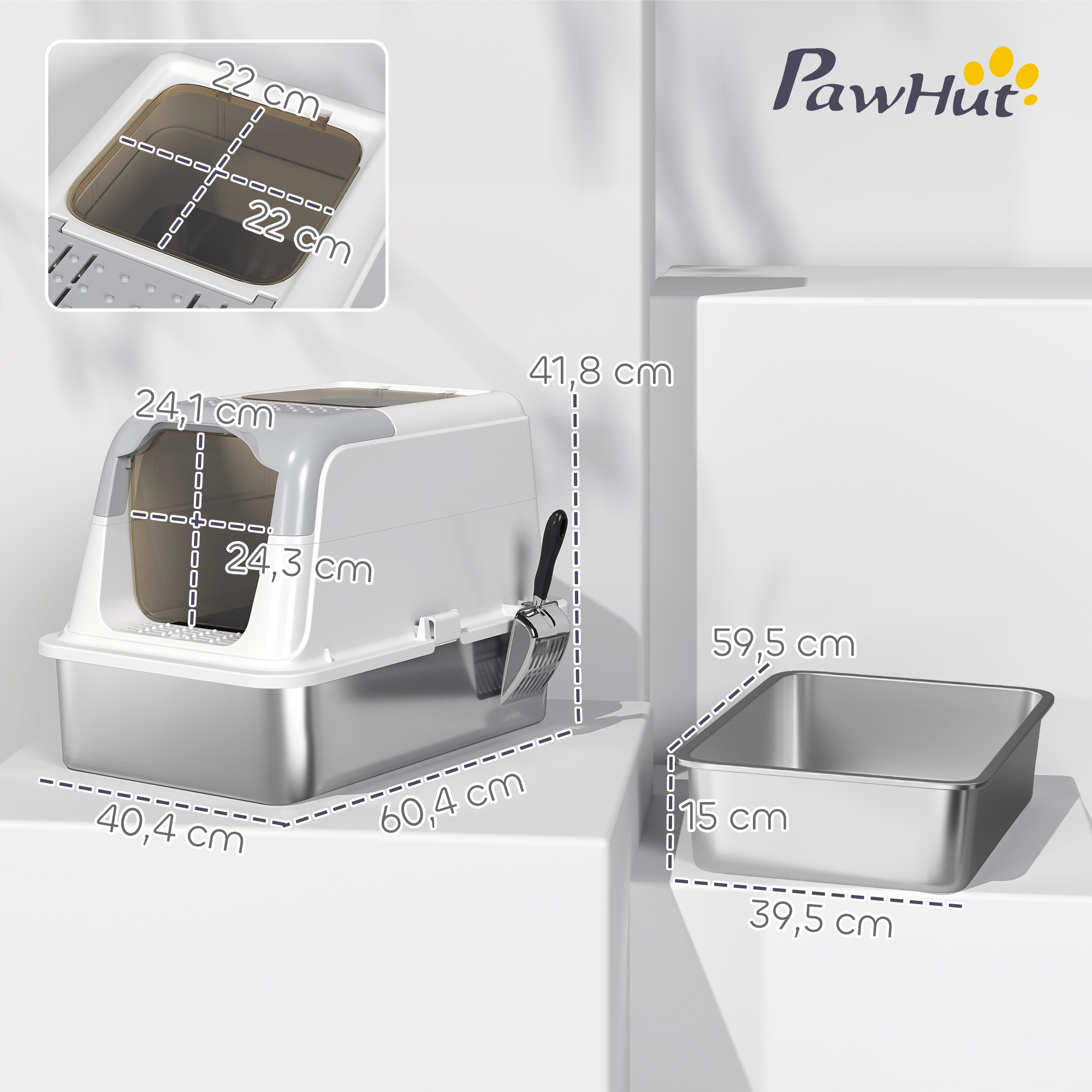 Produktinformationen "Katzenklo, Katzentoilette mit Deckel, Streuschaufel, vorne Eingang und ober Ausgang Edelstahl bis 7 kg"