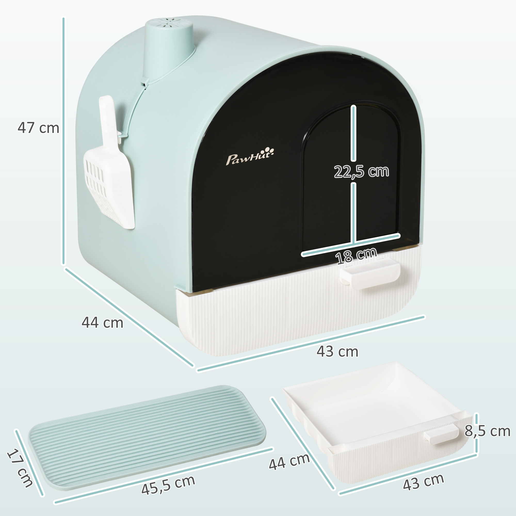 Diese Katzentoilette von PawHut bietet Ihrer Katze angenehme Privatsphäre und sorgt dafür, dass sie sich wohlfühlt, wenn sie ihr Geschäft verrichtet, Ein leichtgängiges Türchen und der mitgelieferte Luftfilter verhindern, dass sich unangenehme Gerüchte verbreiten, Dank des herausziehbaren Streufachs und der mitgelieferten Streuschaufel gestaltet sich die Reinigung besonders einfach, Daneben passen die angenehmen Pastellfarben und die raffinierte Form des Gehäuses zu fast jedem Einrichtungsstil,