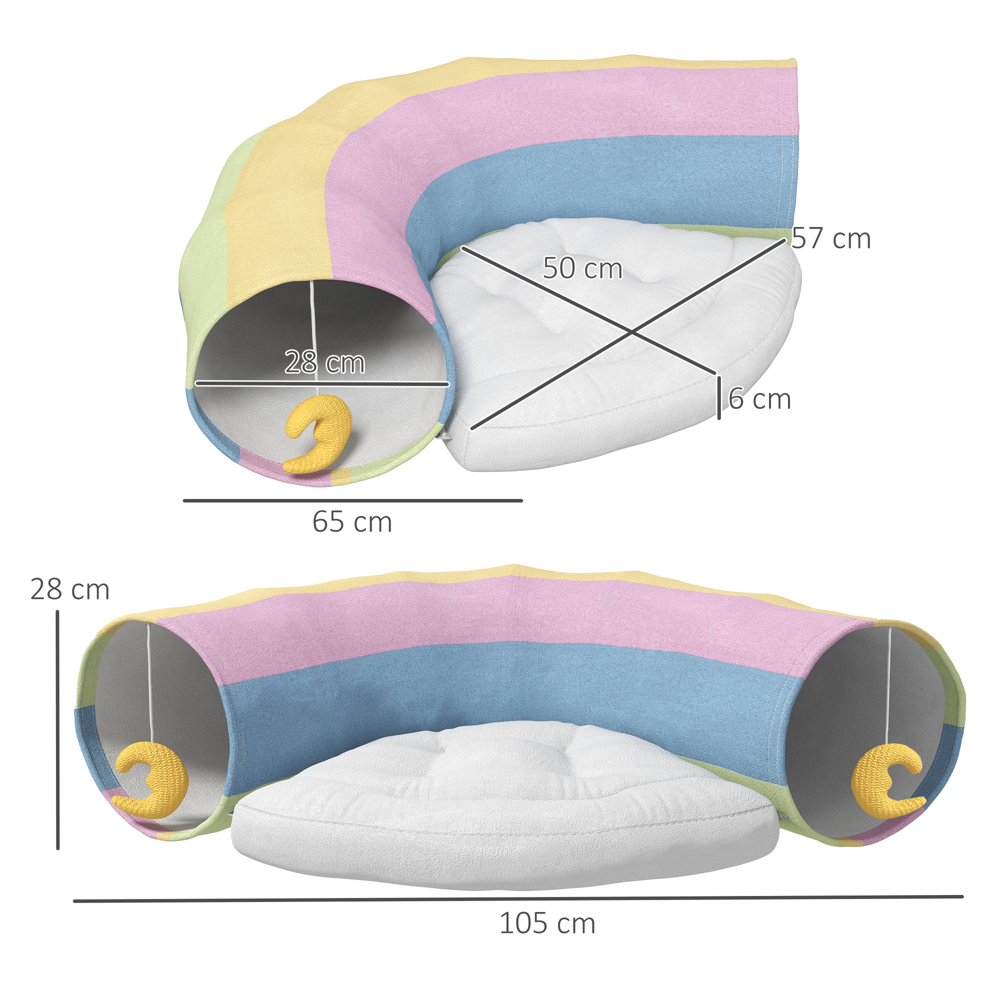 Produktinformationen "Katzentunnel Katzenspielzeug, 2 Spielzeuge, 1 Liegepolster, verspieltes Design, 105 cm x 65 cm x 28 cm, Mehrfarbig"