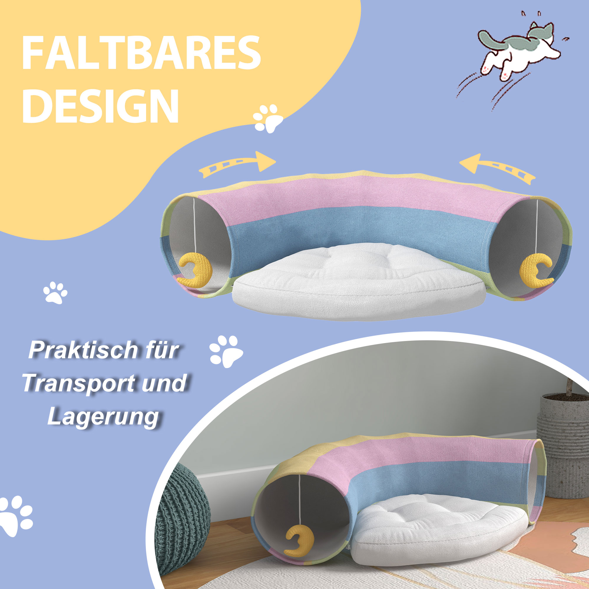 Katzentunnel Katzenspielzeug, 2 Spielzeuge, 1 Liegepolster, verspieltes Design, 105 cm x 65 cm x 28 cm, Mehrfarbig