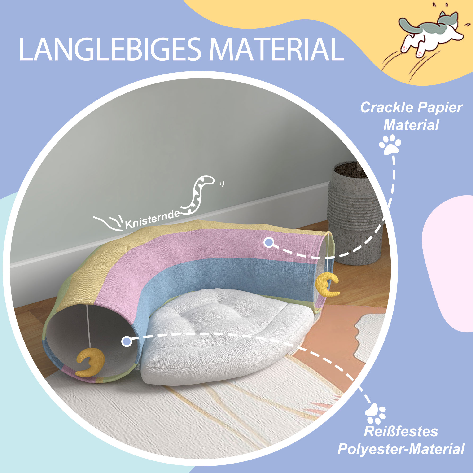 Heben Sie die Spielzeit Ihrer Katze auf ein neues Level mit unserem Katzenspieltunnel von Pawhut, Dieses multifunktionale Paradies vereint den Charme einer gemütlichen Katzenhöhle mit einer kuscheligen, mit Reißverschluss verschließbaren Polsterung, einem brillant farbenfrohen Tunnel, der für endloses Erkunden gestaltet wurde, und nicht nur einem, sondern gleich zwei faszinierenden Katzenspielzeugen,