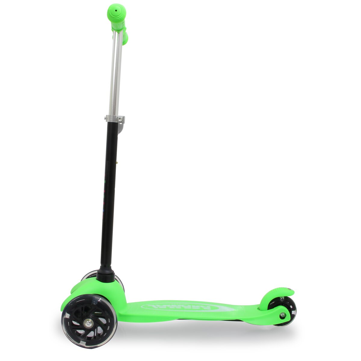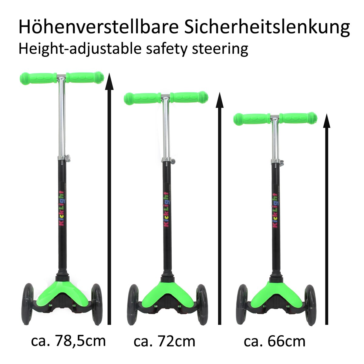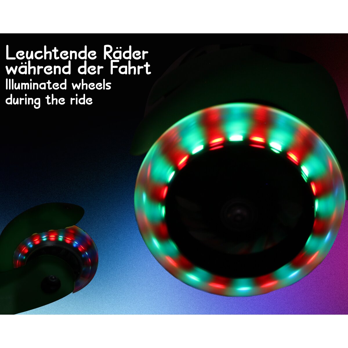 Der Kick-Light-Scooter von JAMARA ist ein Must-Have Spaßgerät für coole Kids. Mit seinen knalligen Farben und der stabilen Konstruktion ist der Roller gleich auf den ersten Blick ein echter Hingucker. Die Lenkstange ist zur Richtungsänderung beweglich und zur Anpassung der Größe höhenverstellbar und bietet dank den Vollgummigriffen mit Sturzpads Grip und Schutz gleichzeitig. Mit einem Klick ist die Lenkstange abnehmbar und der Roller kann so leicht und platzsparend transportiert werden. Am auffälligsten sind aber die coolen LED Räder vorn und hinten die beim Drehen in bunten Farben leuchten (keine Batterie nötig). Mit zwei großen Rollen vorne und einer Rolle mit Fußbremse hinten und den eingebauten robusten ABEC7 Kugellagern, ist der JAMARA Kick Light Scooter ideal für kleine Fahranfänger und optimal zum Training des Gleichgewichtssinnes.