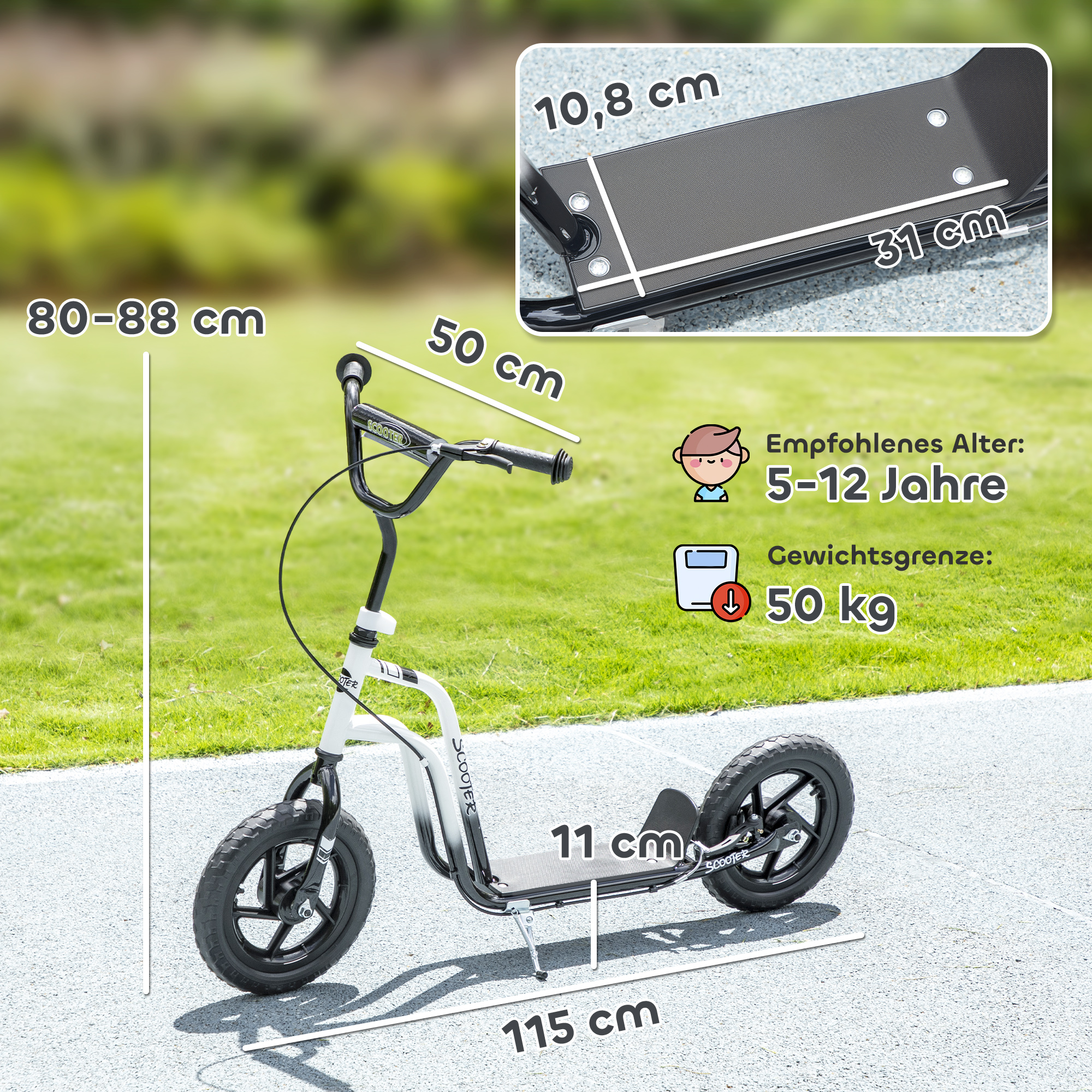 • All-Terrain-Großräder: Mit seinen großen 12-Zoll-EVA-Rädern meistert dieser Kinder Roller problemlos Grasflächen und unebene Wege und verspricht eine außergewöhnlich glatte Fahrt
