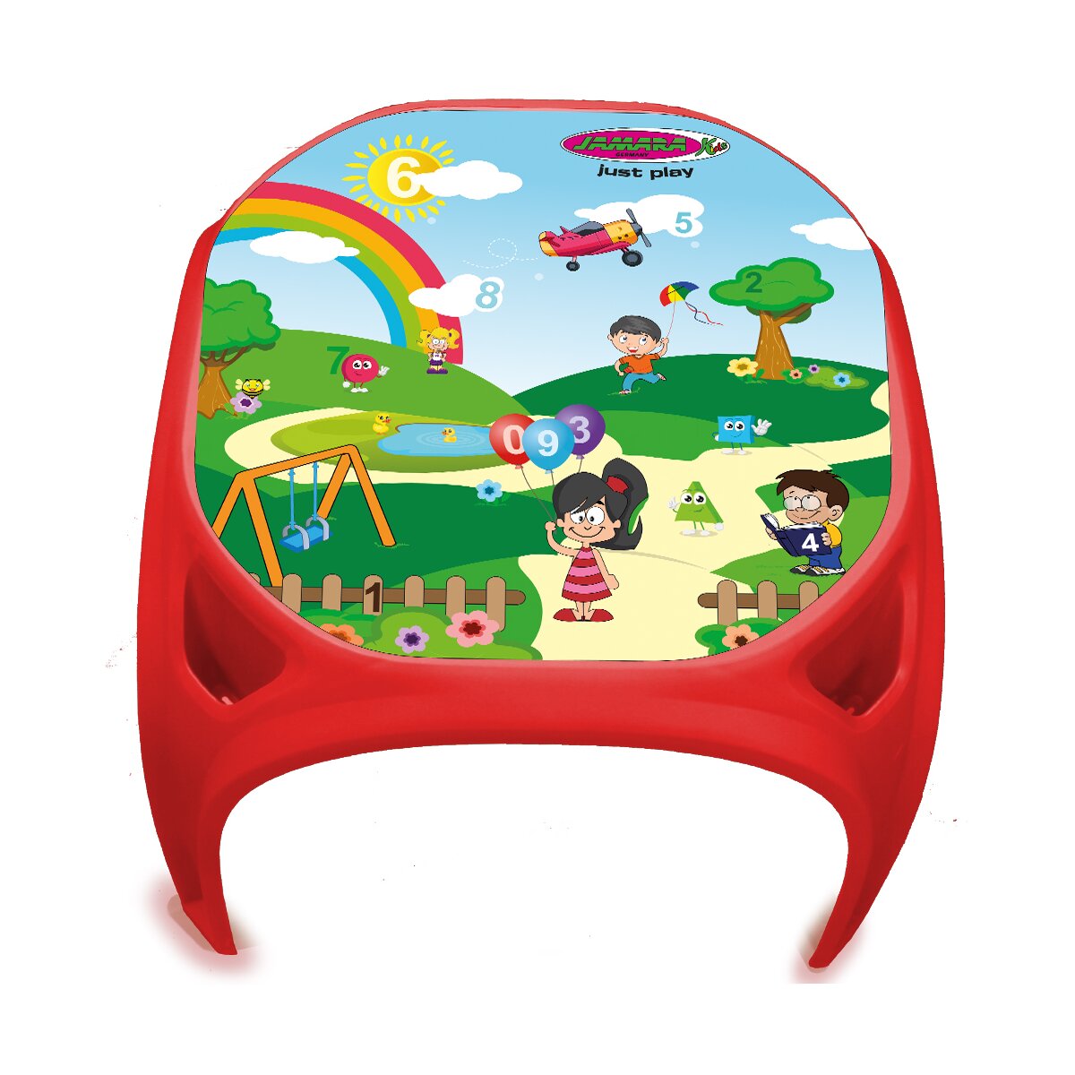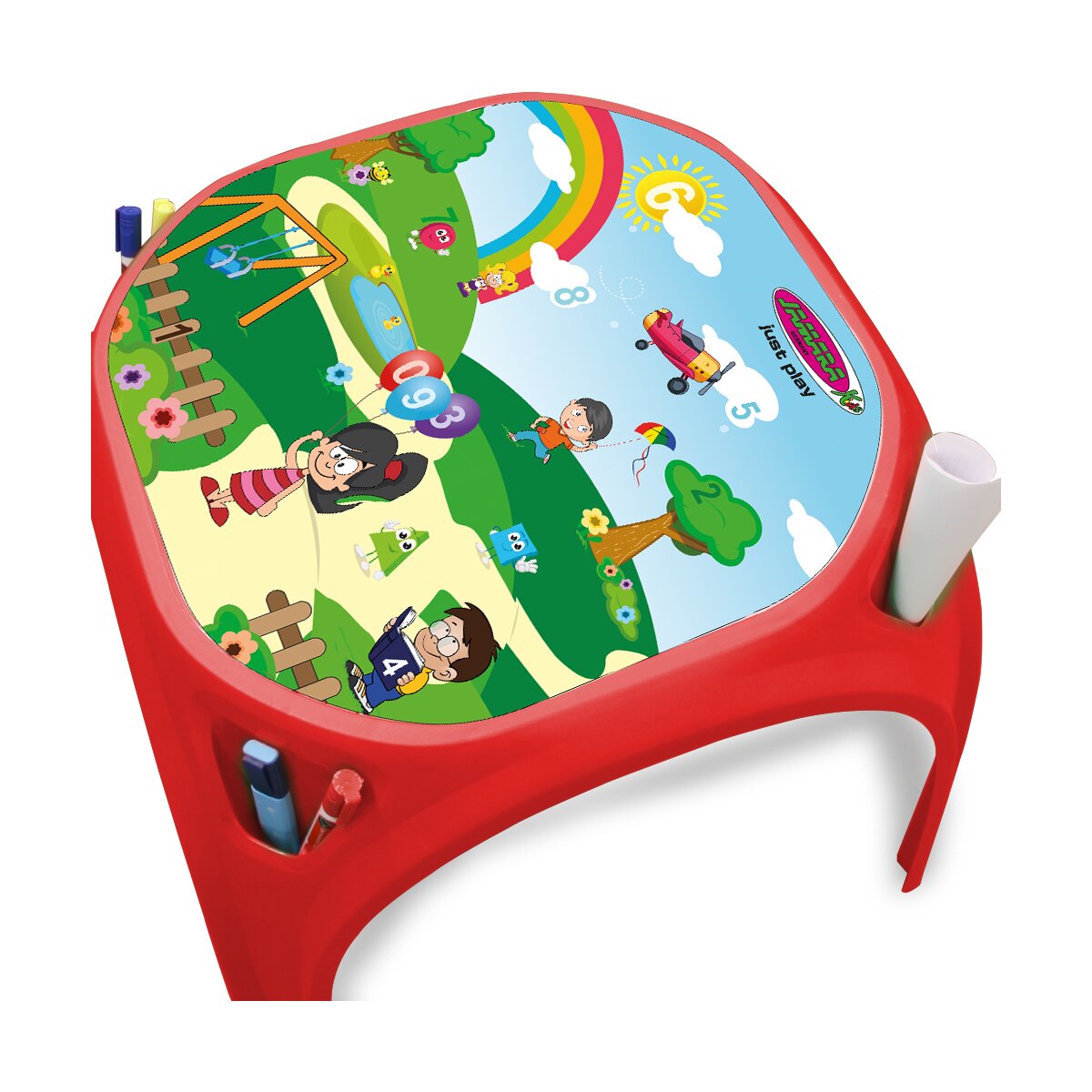 Ein Kindertisch mit anspechendem abgerundetem Design, stabilen Gummifüßen und einem farbigen Motivdruck der mit Zahlen und Bildern spielerisch zum Lernen motiviert.