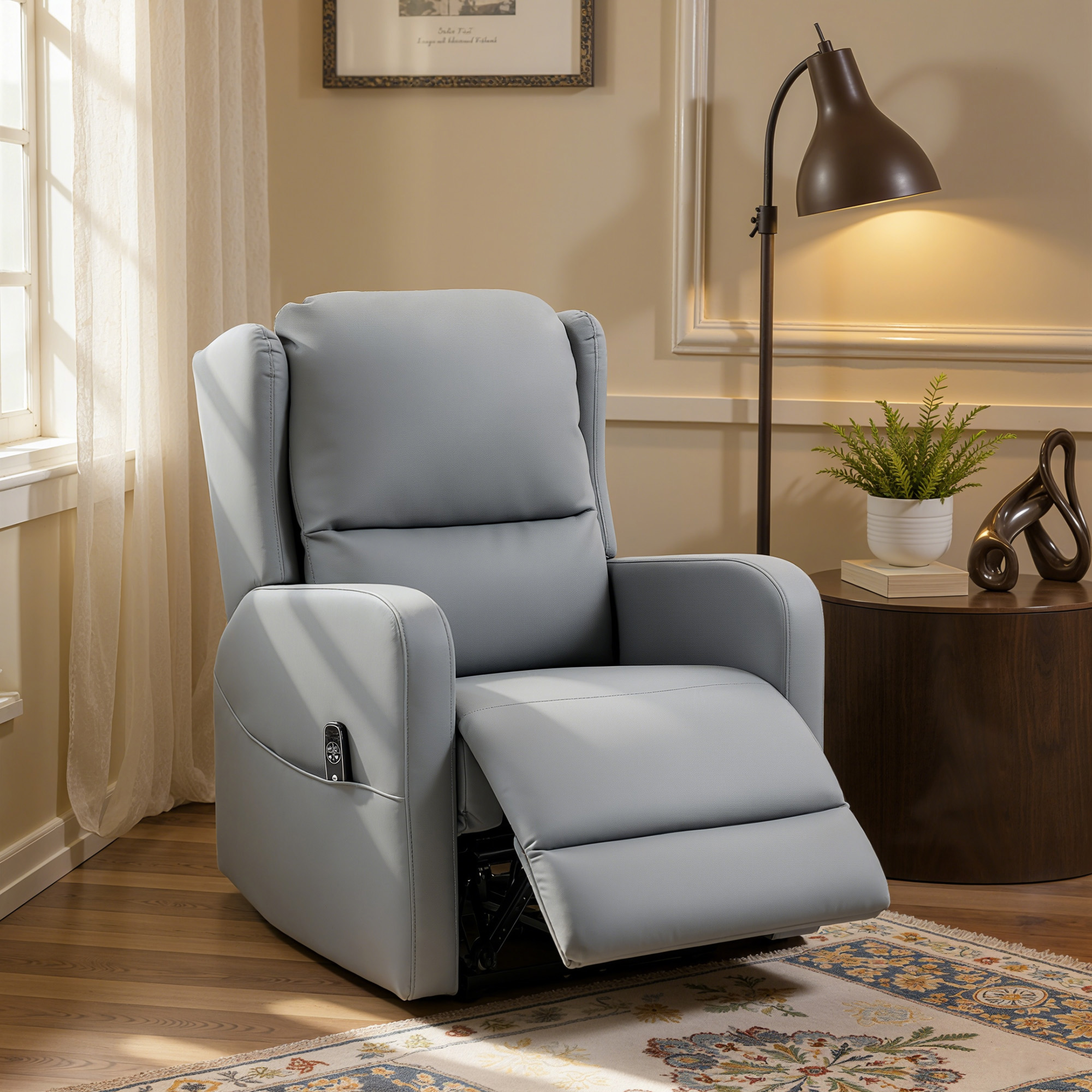 Produktinformationen "Massagesessel mit Rücklehnfunktion, Kunstleder, elektrisch verstellbar, Fußstütze, Seitentasche, Stahlrahmen, Grau"