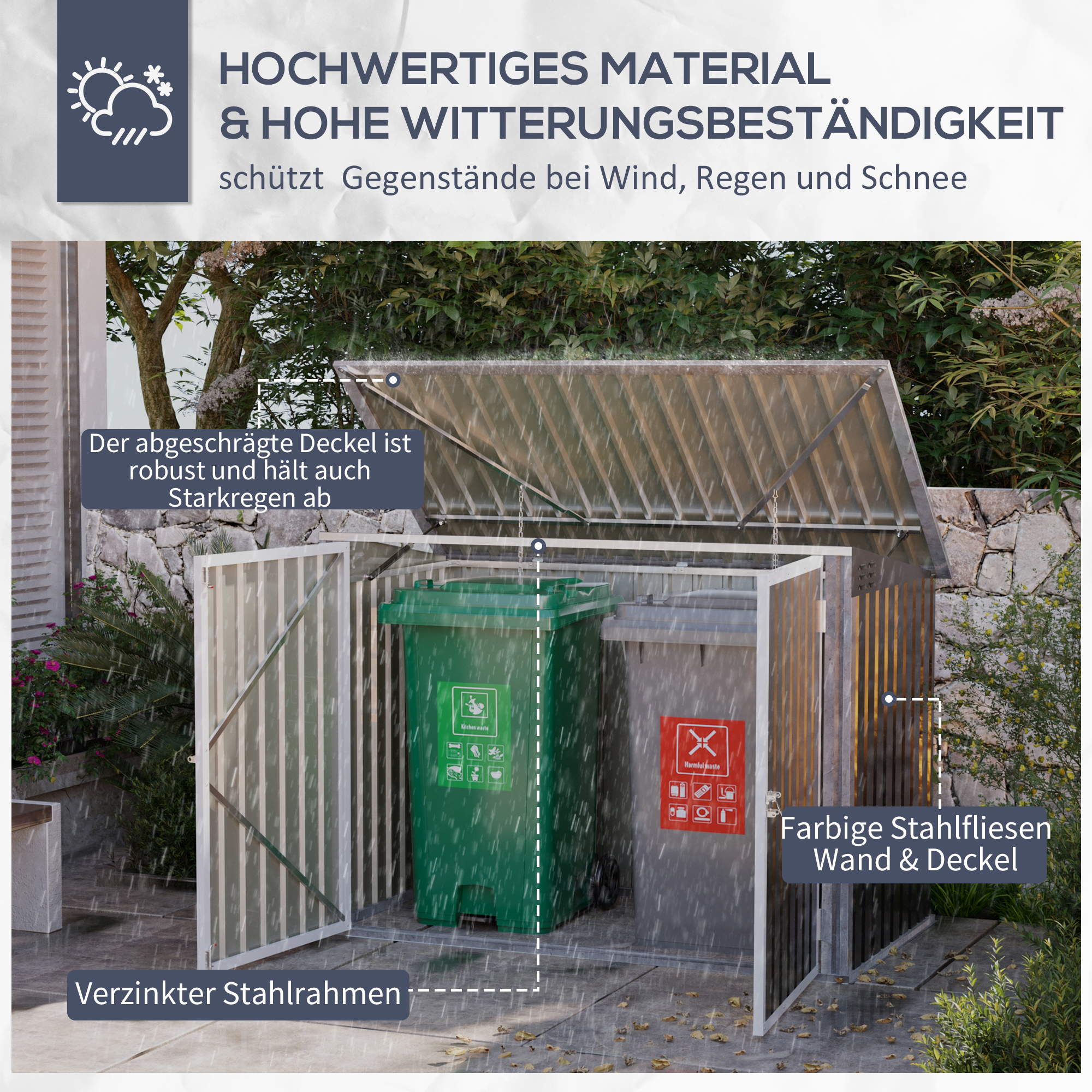 • Mälltonnen-Schutzschuppen: Bewahren Sie Ihre Mülltonnen vor den Auswirkungen der Witterung und hindern Sie Tiere daran, den Müll zu durchwühlen, mit diesem abschließbaren, kompakten Schuppen,