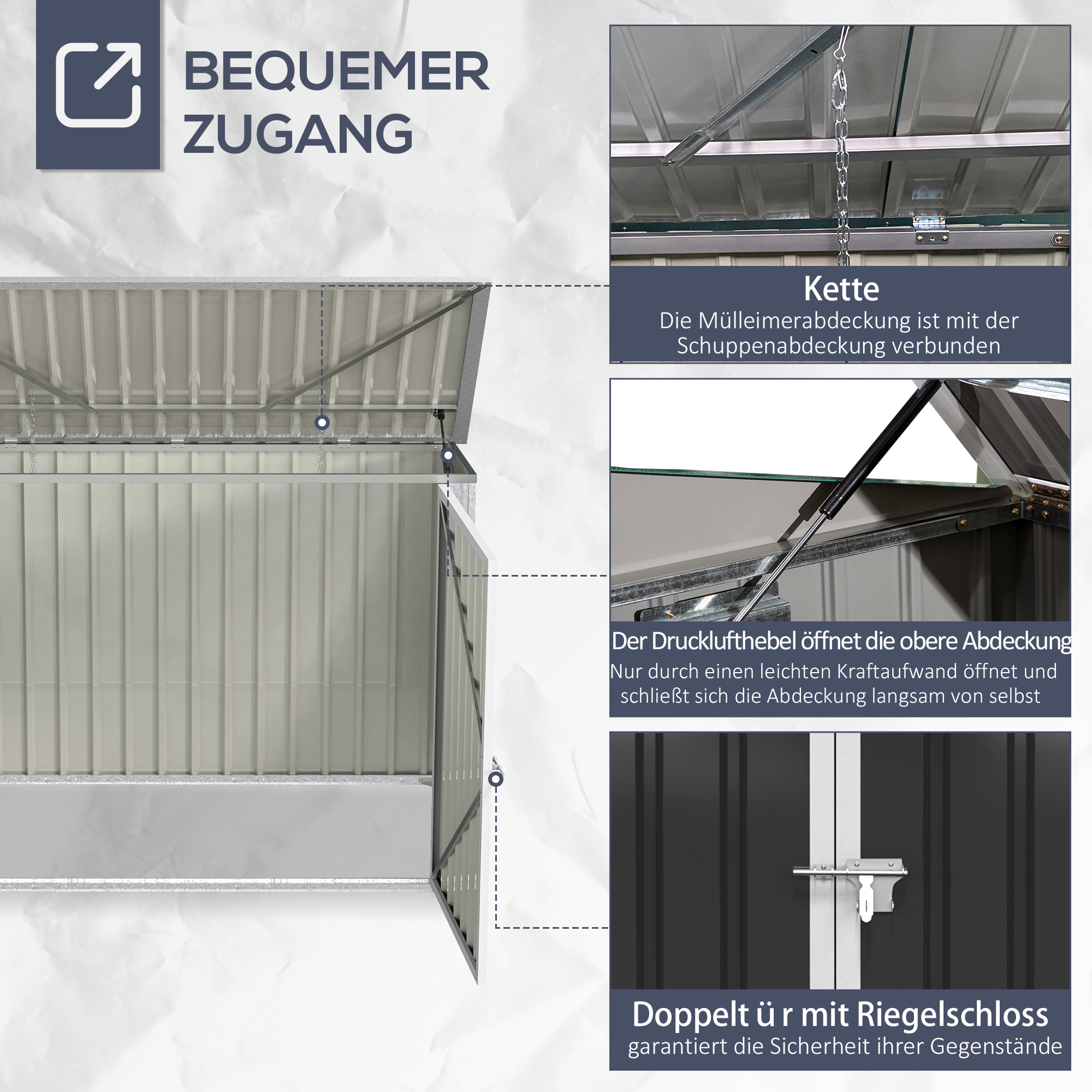 • Sicheres Verschließen: Der Schuppen verfügt über eine abschließbare Doppeltür mit Schloss, und das pneumatische Dach kann unabhängig geöffnet werden, um den Müll zu entsorgen oder die Mülltonnen problemlos ein- und auszusetzen,