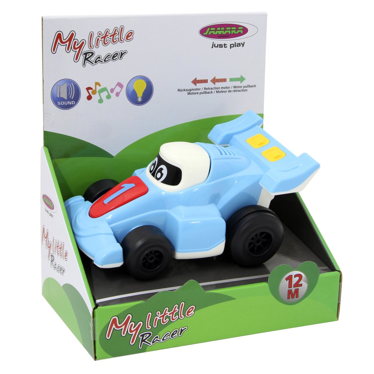 Die bunten My Little Fahrzeuge von Jamara bringen Abwechslung und Spielspaß ins Kinderzimmer. Einfach das Auto zurückziehen und schon spannt sich der Rückzugsmotor. Losgelassen flitzt das Auto los. Die lustigen kleinen Fahrzeuge kommen in zwei Varianten in den Handel. Zum einen ein Rennwagen in rot und blau und zum anderen ein Einsatzwagen ebenfalls in zwei Farben. Alle Fahrzeuge haben eine Taste für Musik, Motorsound und Hupe und können mit ihren lustigen Lichtern blinken. Hochwertiger Kunststoff der an allen Kanten kindgerecht abgerundet und leicht zu reinigen ist runden die Ausstattung dieses liebevoll für den Markt ausgesuchten Kinderspielzeuges ab. My Little-Racer und My Little-Car von JAMARA ist empfohlen für Kleinkinder ab einem Jahr.