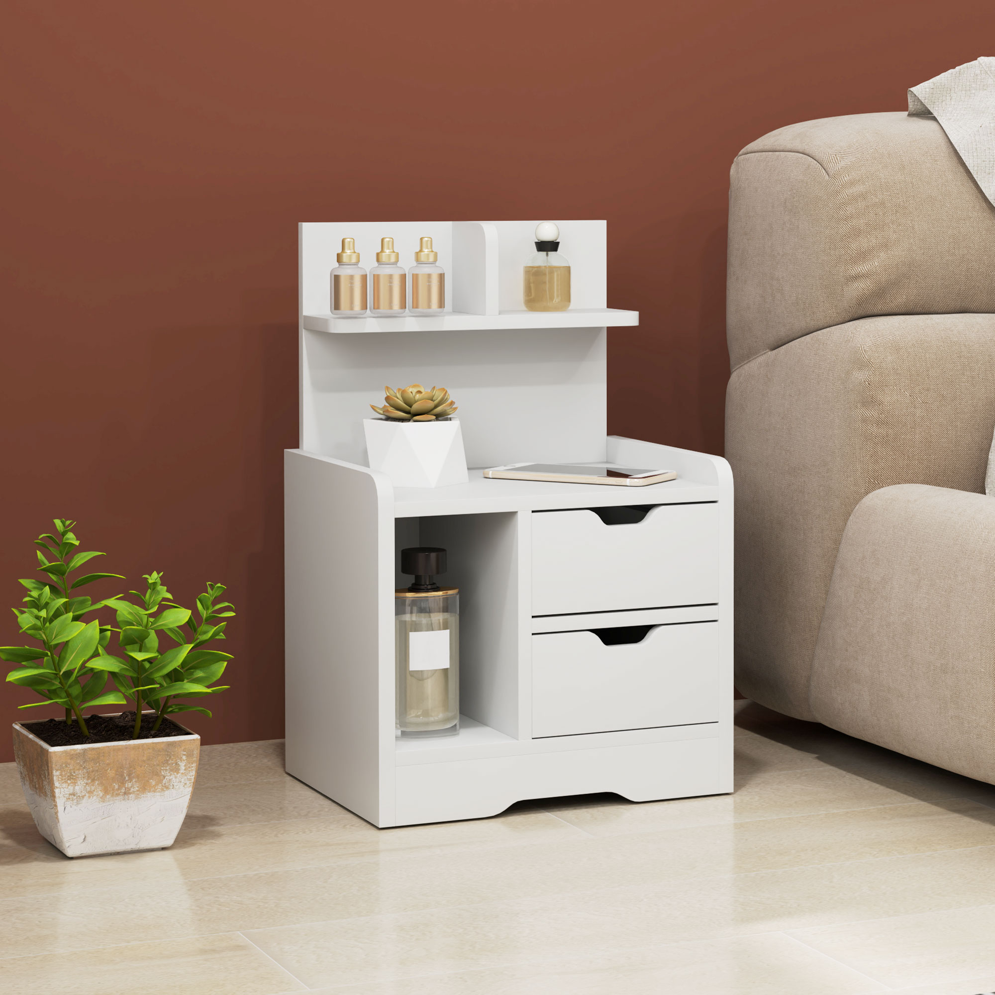 Entdecken Sie den stilvollen Beistelltisch von HOMCOM, der frischen Wind in Ihr Zuhause bringt, Dieser Nachttisch vereint Eleganz und Funktionalität und bietet Ihnen vielseitigen Stauraum für Wecker, Bücher und Pflanzen, Die zwei praktischen Schubladen des Nachtschranks sind ideal für persönliche Gegenstände und sorgen für Ordnung, Verleihen Sie Ihrem Raum einen Hauch von Raffinesse und genießen Sie die perfekte Aufbewahrungslösung, die sowohl praktisch als auch ästhetisch ansprechend ist,