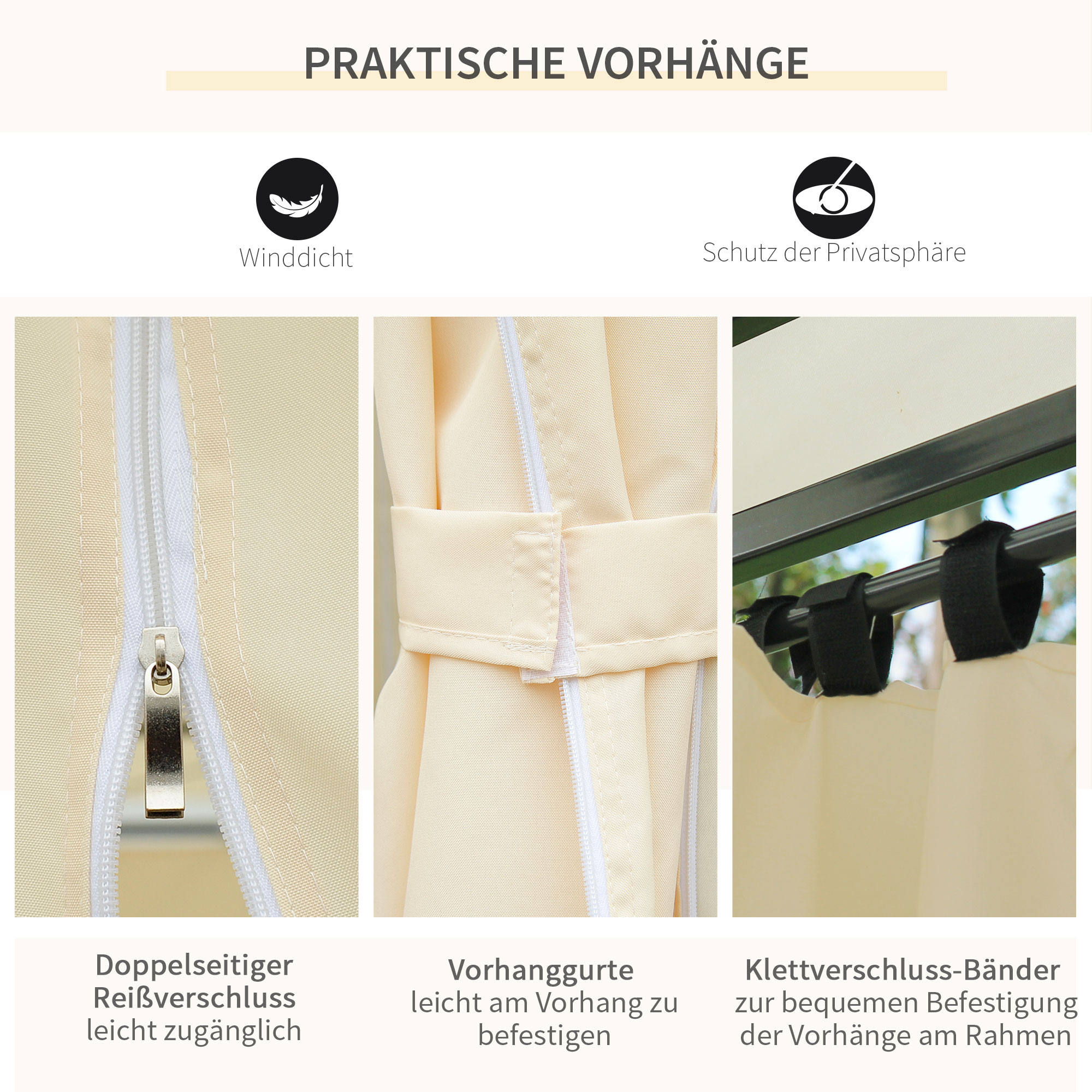 Sichern Sie sich mit diesem geschmackvollen und geräumigen Pavillon von Outsunny Ihren privaten Raum zum Erholen und Entspannen, Der luxuriöse Gartenpavillon wird von einem dekorativen und hochstabilen Stahlgestell gehalten, der durch Robustheit und Witterungsbeständigkeit überzeugt, Das wasserabweisende Doppeldach ist aus 180 g/m² starkem Polyester gefertigt, sodass es Sie sicher vor Sonne und Regen schützt, Als praktischer Sicht- und weiterer Sonnenschutz dienen elegante, weiße Seitenwände,