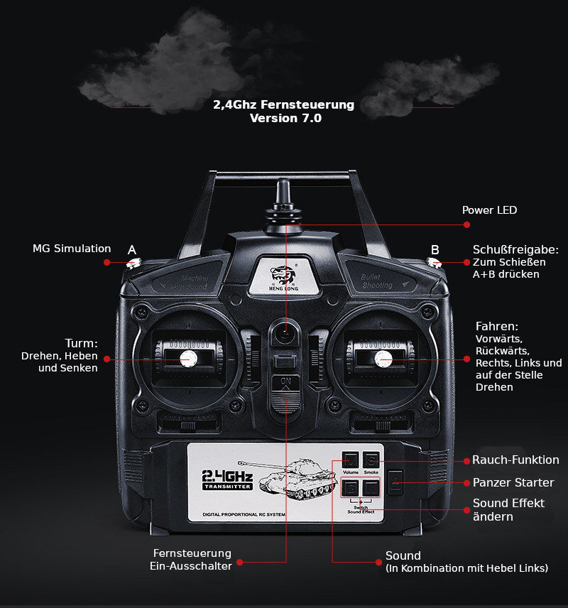 Fernbedienung: Vorwärts / rückwärts normal und HIGH SPEED, vorwärts Links- oder Rechtsdrehung, rückwärts Links- oder Rechtsdrehung , Kanone heben und senken, Geschützturm um 320° drehbar (160° rechts / 160° links), Munitionsabschuss auch während der Fahrt