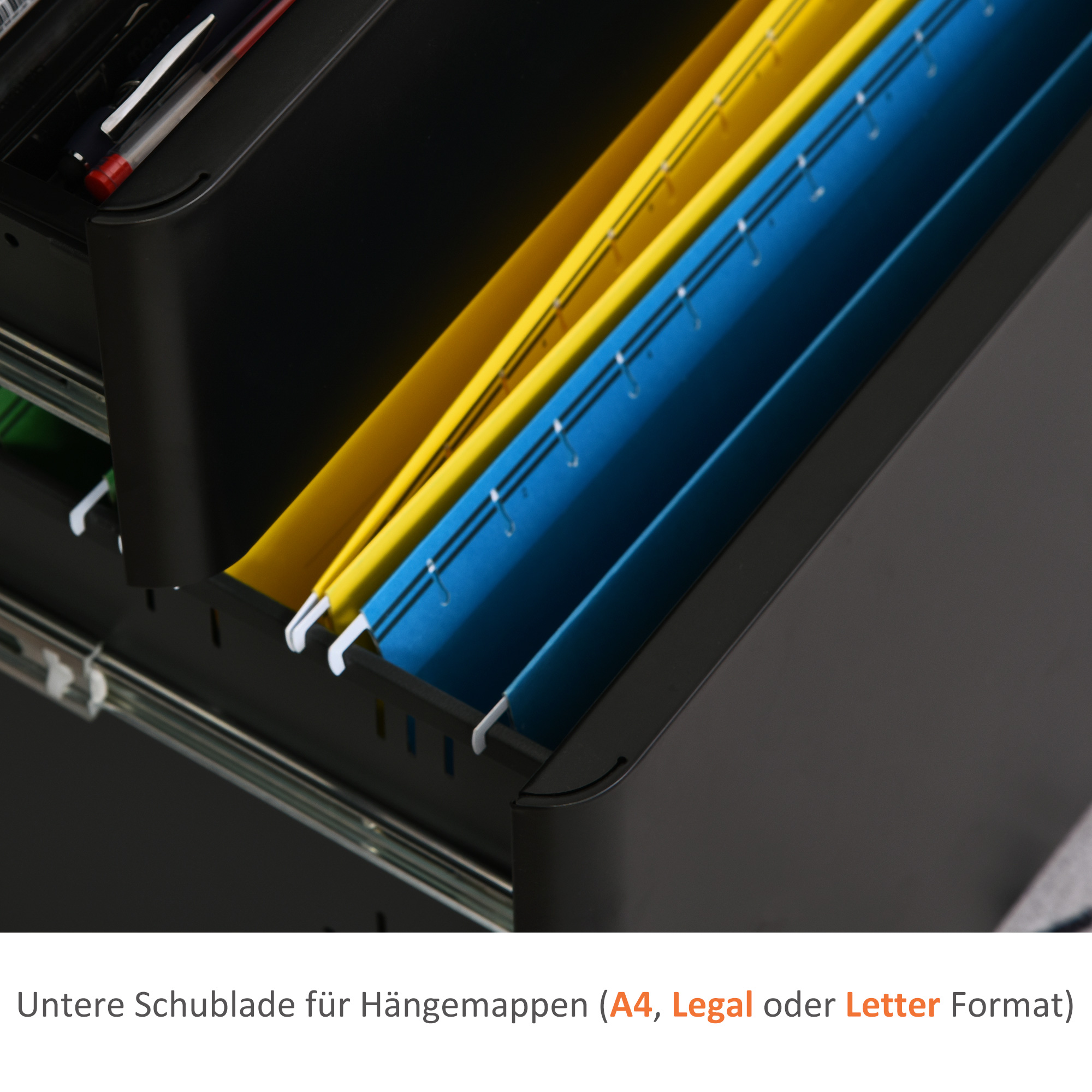 Halten Sie Ihre Unterlagen sicher und ordentlich mit unserem Rollcontainer fürs Büro, Mit zwei praktischen Schubladen für Büromaterialien und einem Hängeregister bietet der Rollcontainer reichlich Stauraum, Das schlichte, kompakte Design passt perfekt in kleinere Räume, sei es zu Hause oder im Büro, Dank der 4 Lenkrollen lässt sich der Aktenschrank mühelos bewegen, während das Stahlgehäuse Langlebigkeit garantiert, Die Schloss am obersten Fach verschließt alle drei Fächer,