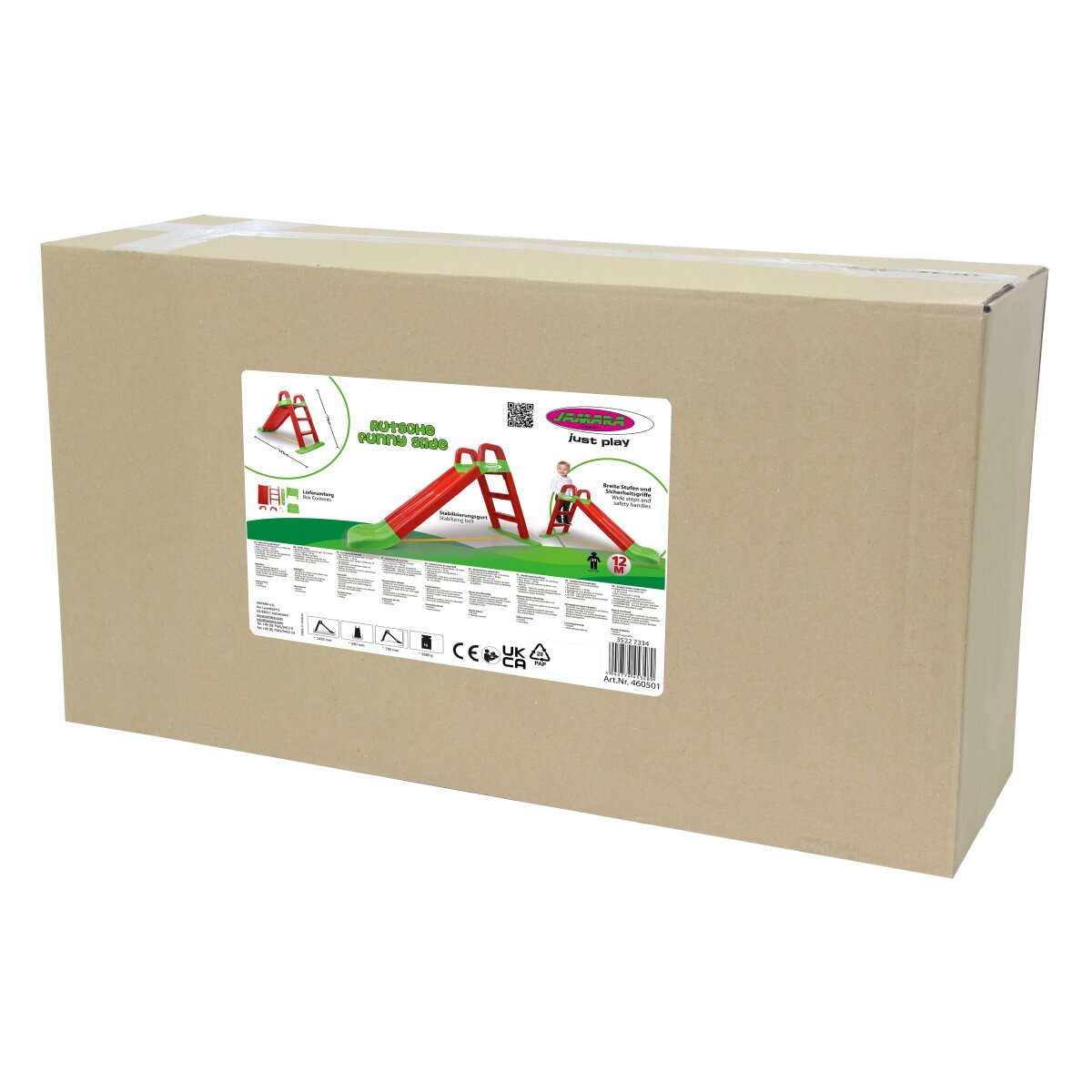 Mit der „Funny Slide“ Kinderrutsche ermöglicht Jamara ein Rutsch Vergnügen auch schon für die ganz Kleinen ab einem Jahr. Durch die leichte Montage der farbenfrohen Rutsche lässt sie sich im Handumdrehen aufbauen. Mit knapp vier Kilo ist die Rutsche Funny Slide ein Leichtgewicht und einfach zu transportieren, trotzdem robust und hält mit der breiten Stufenleiter auch wilden Spielen stand. Oben auf der Leiter angekommen sorgen große Sicherheitsgriffe für festen Halt und der große Rutschauslauf sorgt für weiche und sichere Landungen. Ein Stabilisierungsseil in der Mitte der Rutsche gibt zusätzliche Sicherheit und somit steht dem Rutsch Vergnügen In- oder Outdoor nichts mehr in Wege.