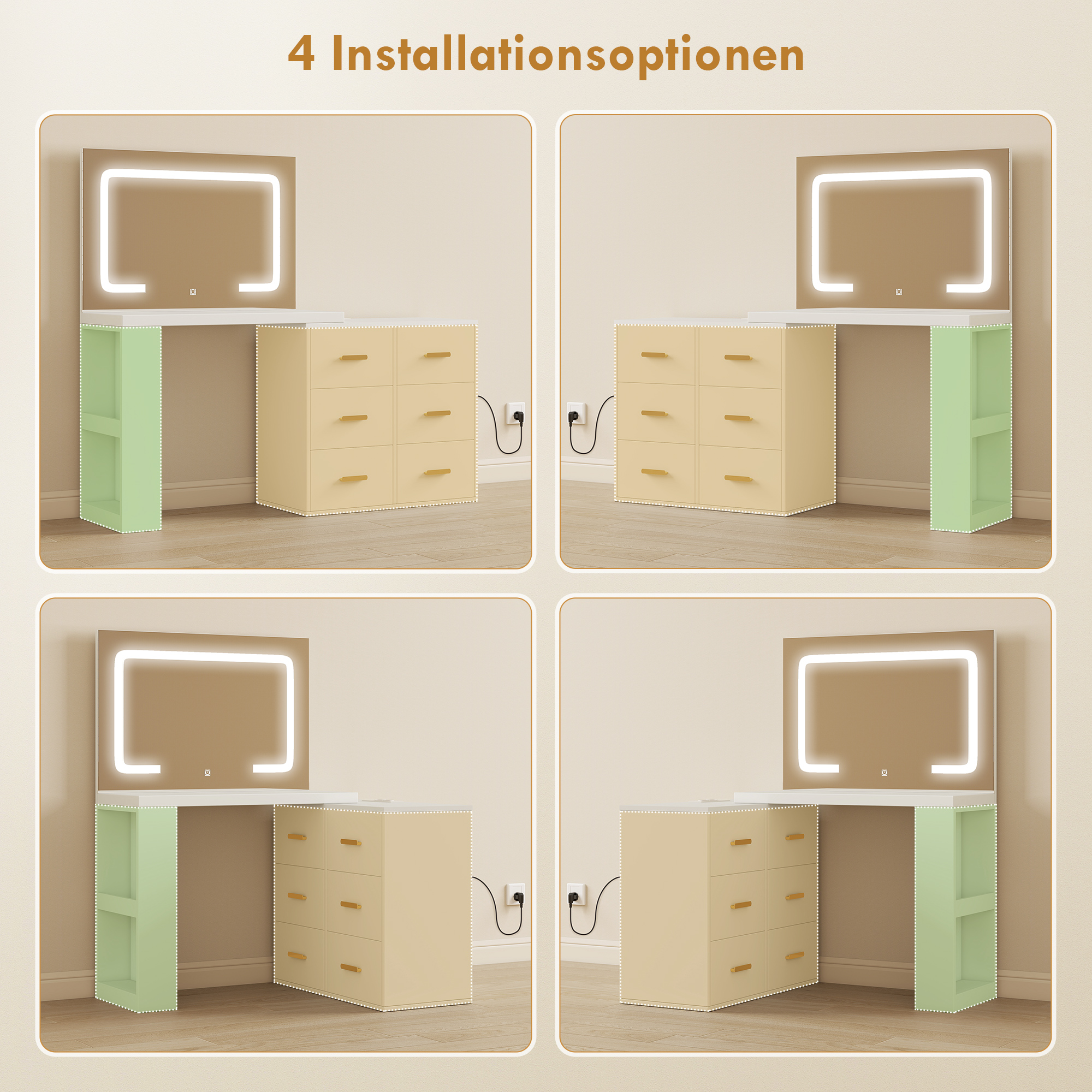 - Vier Installationsmöglichkeiten des Frisiertisches ermöglichen die Auswahl der für Ihre Bedürfnisse passenden Einrichtung
