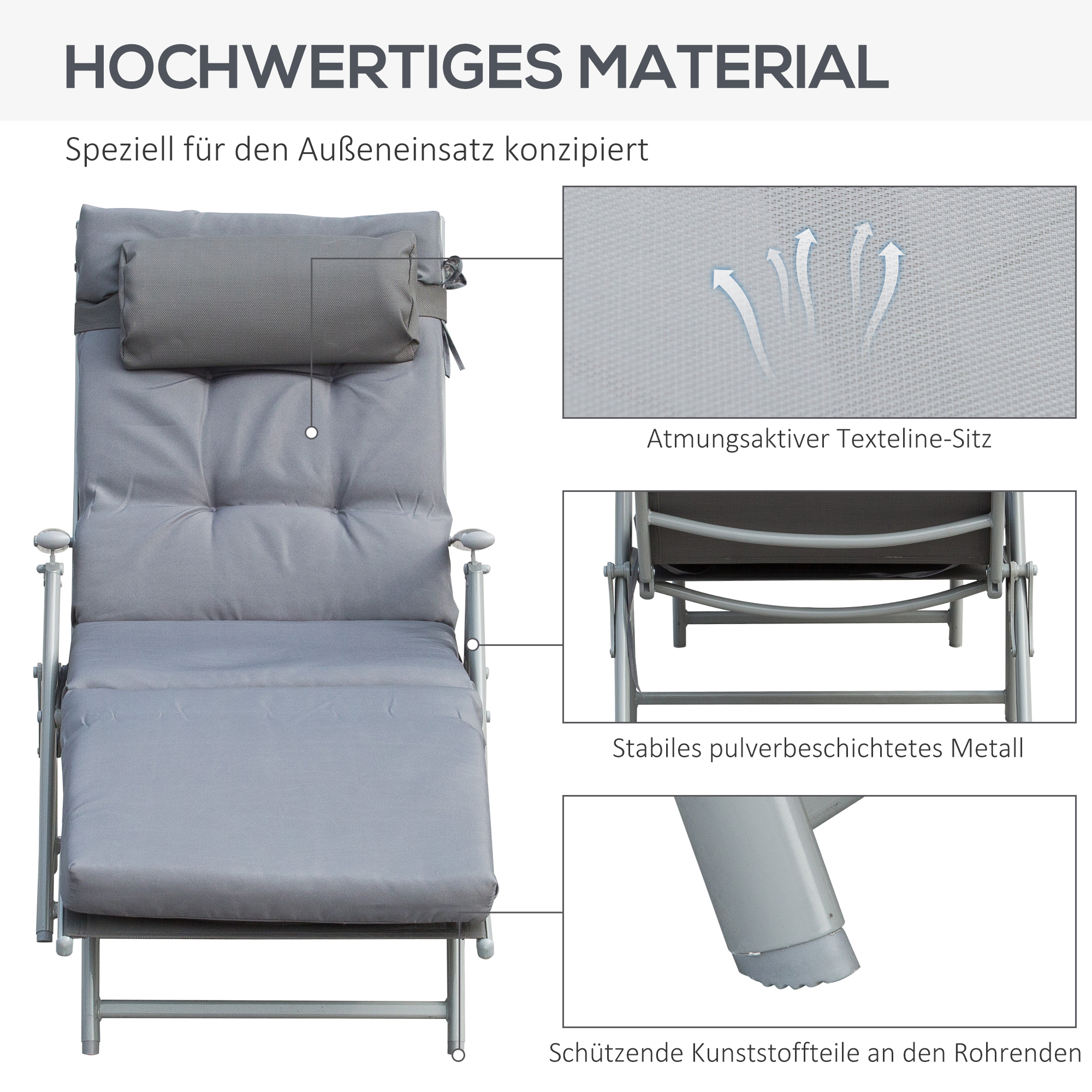 Sonnenliege klappbar Strandliege mit Kopfkissen Sitzkissen Liegestuhl mit 7-Fach verstellbare Rückenlehne Gartenliege Relaxliege bis 165 kg belastbar, für Garten Urlaub Outdoor, Grau
