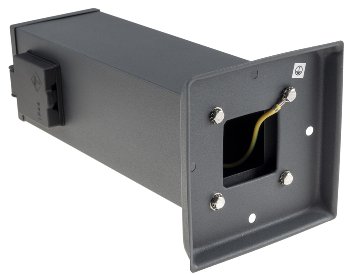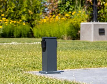 Moderne Steckdosensäule mit 2 Schutzkontakt-Steckdosen und erhöhtem Berührungsschutz. Gartensteckdose aus robustem Edelstahl-Gehäuse und Schutzart IP44 - hoher Schutz gegen Spritzwasser und Fremdkörper. Gefertigt für den permanenten Einsatz im Aussenbereich rundum Haus und Garten. Der Kabelanschkluss erfolgt im geschützten Innenbereich der Säule.