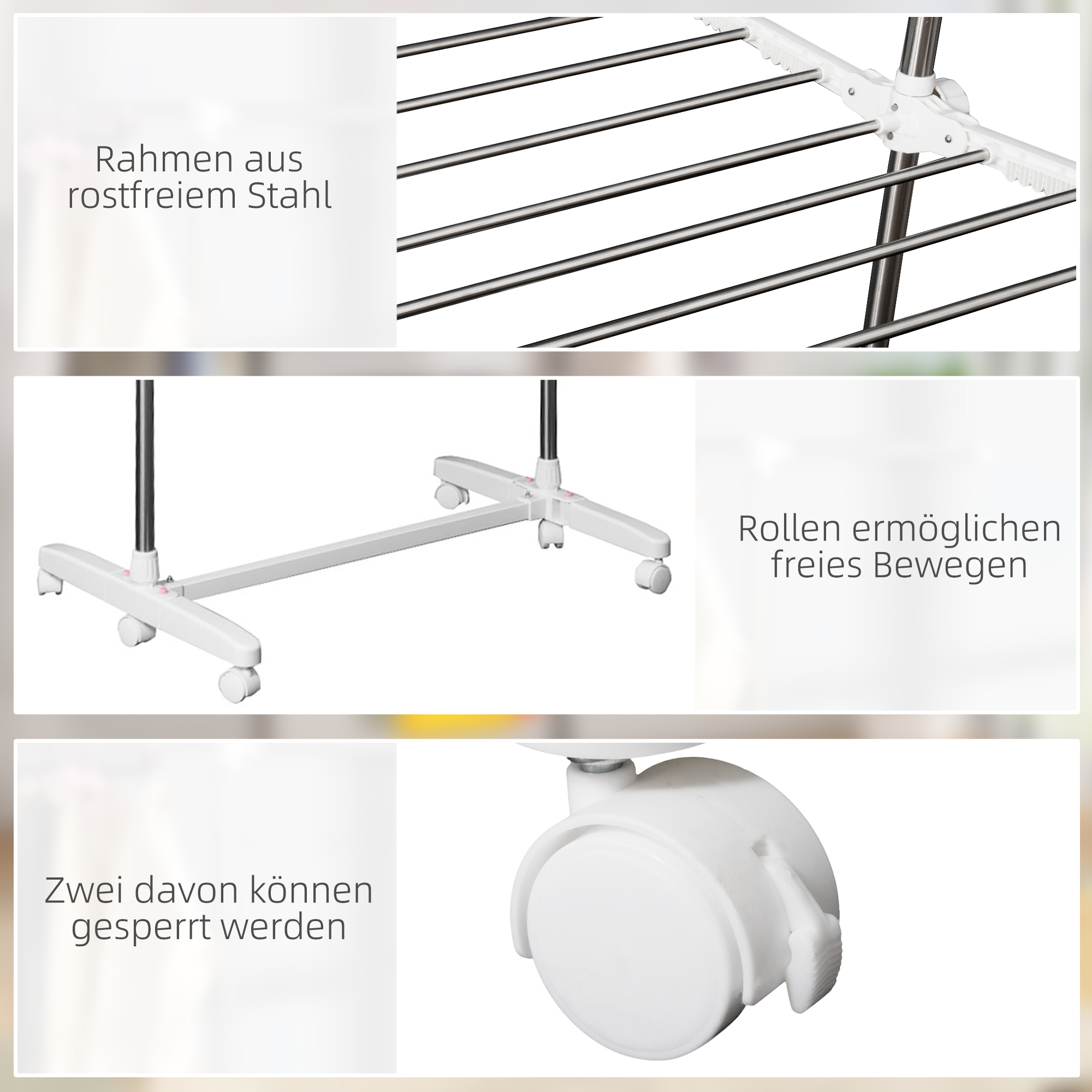 Dieser Wäscheständer im klassischen hellen Design verbindet hohe Qualität, Nützlichkeit und Platzersparnis ganz in einem, Mit sechs Fußrollen und Bremsen ist der Wäscheständer praktisch und mobil, somit kann er nicht nur im Innen- sondern auch im Außenbereich vielseitig eingesetzt werden, Er erfüllt viele Anforderungen des täglichen Gebrauchs und ist in jedem Haushalt vor allem für große Familien eine nützliche und erleichternde Ergänzung,