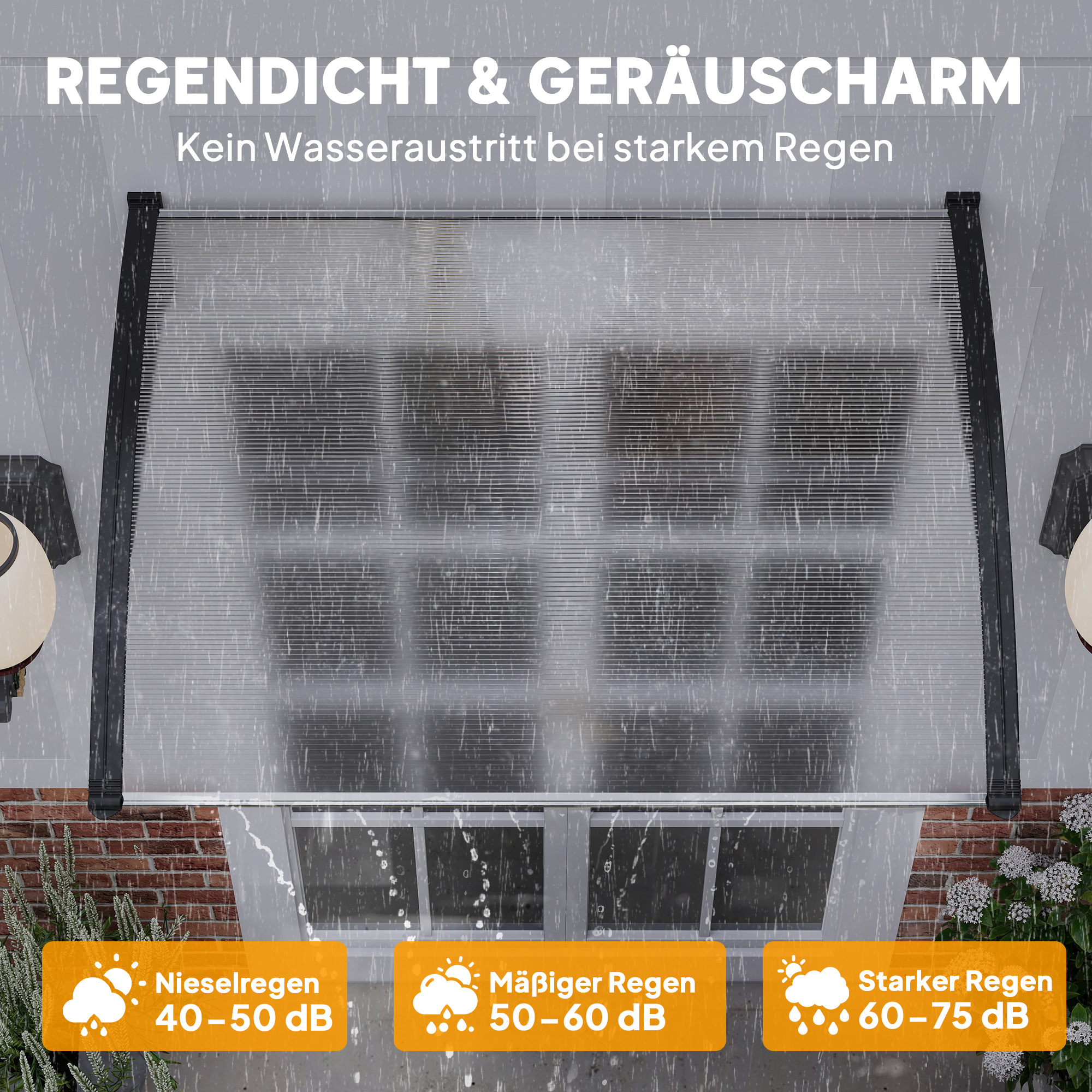 Das Vordach von Outsunny bieten Rundumschutz, Sie sind ideal, um Türen und Fenster vor schlechtem Wetter oder direkter Sonneneinstrahlung zu schützen, Sie bestehen aus Polycarbonatplatten, haben starre Kunststoffhalter zur Befestigung an der Wand und Aluminiumprofile an den Enden und in der Mitte, Ihre gebogene Form bietet einen besseren Schutz und verhindert die Ansammlung von Wasser, Die UV-Schutzbeschichtung verhindert, dass sich das Haus im Sommer durch die Sonneneinstrahlung aufheizt,