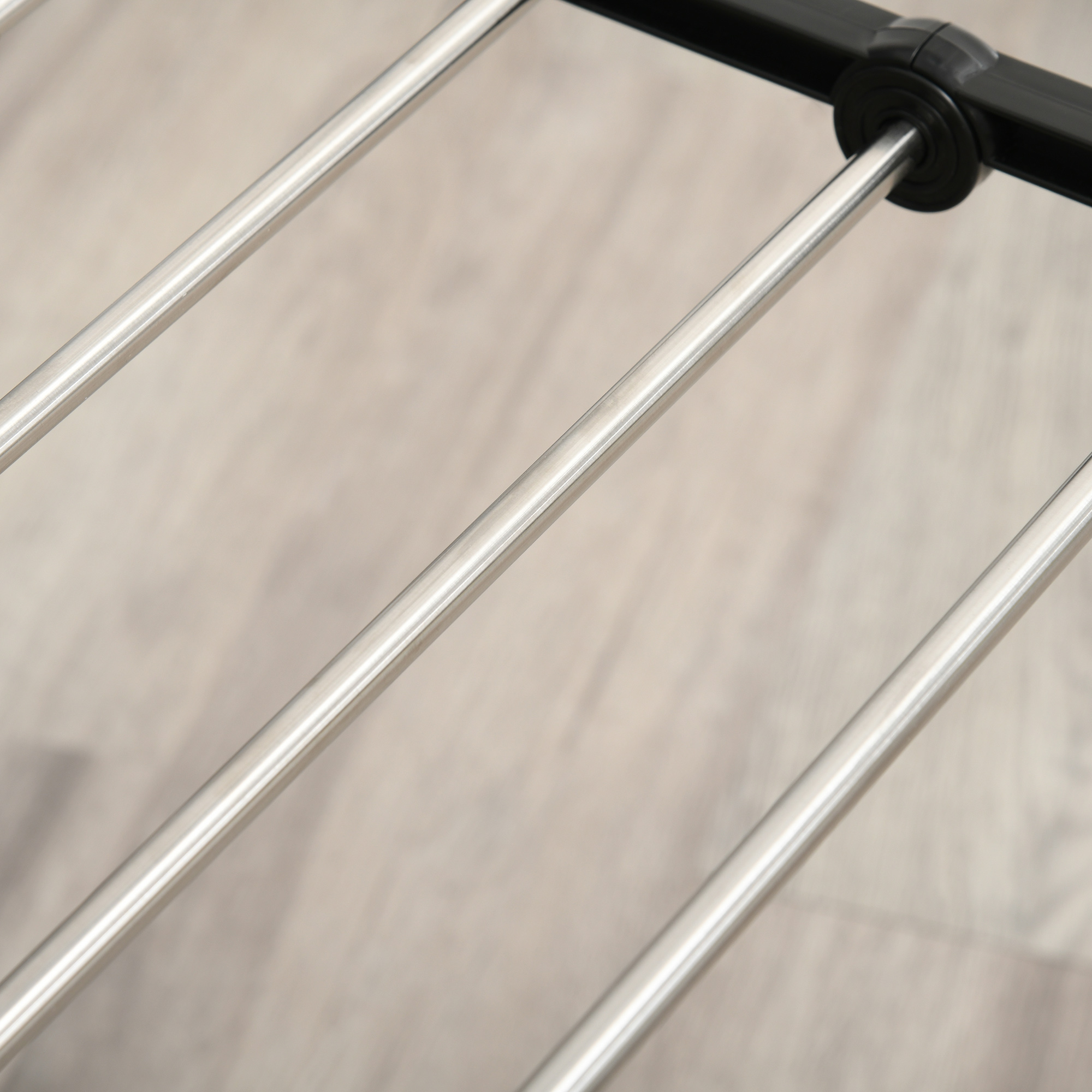 Dieser Ausziehbarer Wäscheständer von HOMCOM verfügt über 3 Ebenen, um ihrer Wäsche aufzuhängen, Dank seiner stabilen Pyramidenform verfügt er über einen sicheren und stabilen Stand, Auf der oberen Kleiderstange lassen sich gut lange Kleidungsstücke aufhängen, Bei Nichtgebrauch lässt sich der Wäscheständer leicht zusammenfalten, Durch sein kompaktes Design lässt er sich auch gut auf den Balkon stellen,