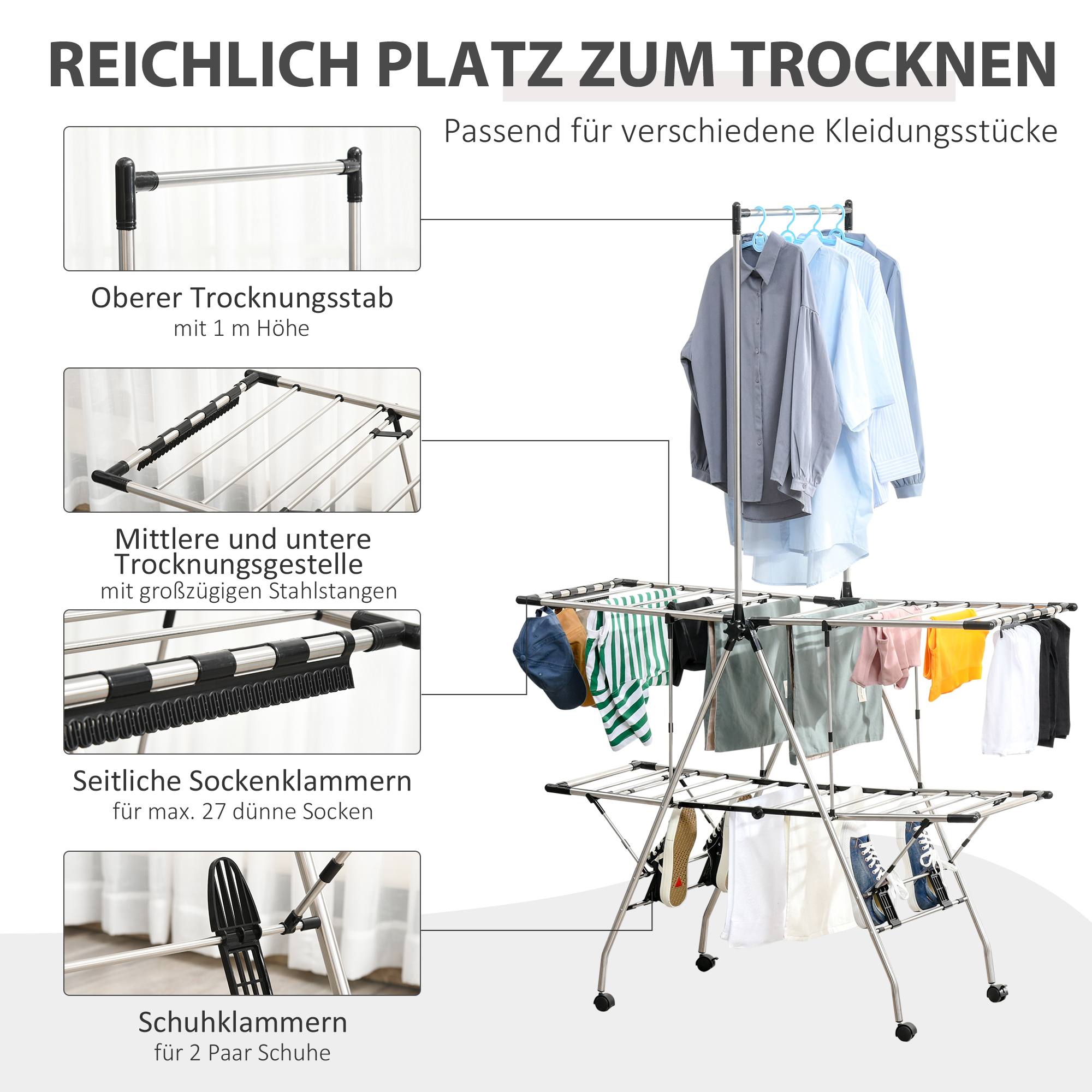 Wäscheständer 1,385 m Trockenlänge tragbar Standtrockner mit Teleskopstangen, Rollen und Bremsen Wäschetrockner Flügelwäscheständer für Innen und Außen, Silber+Schwarz