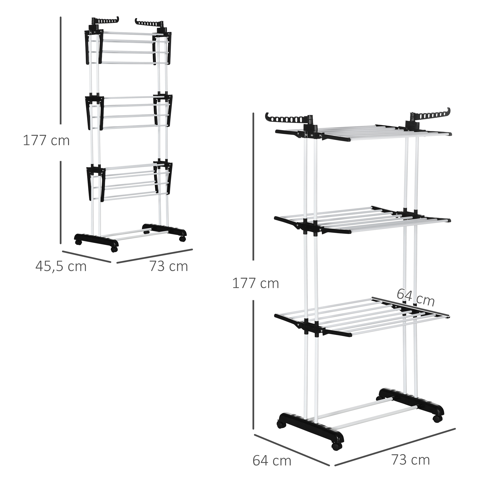 Wäscheständer, 4 Ebenen, klappbar, 4 Rollen mit 2 Bremsen, Metallrahmen, Schwarz, 73 x 64 x 177cm