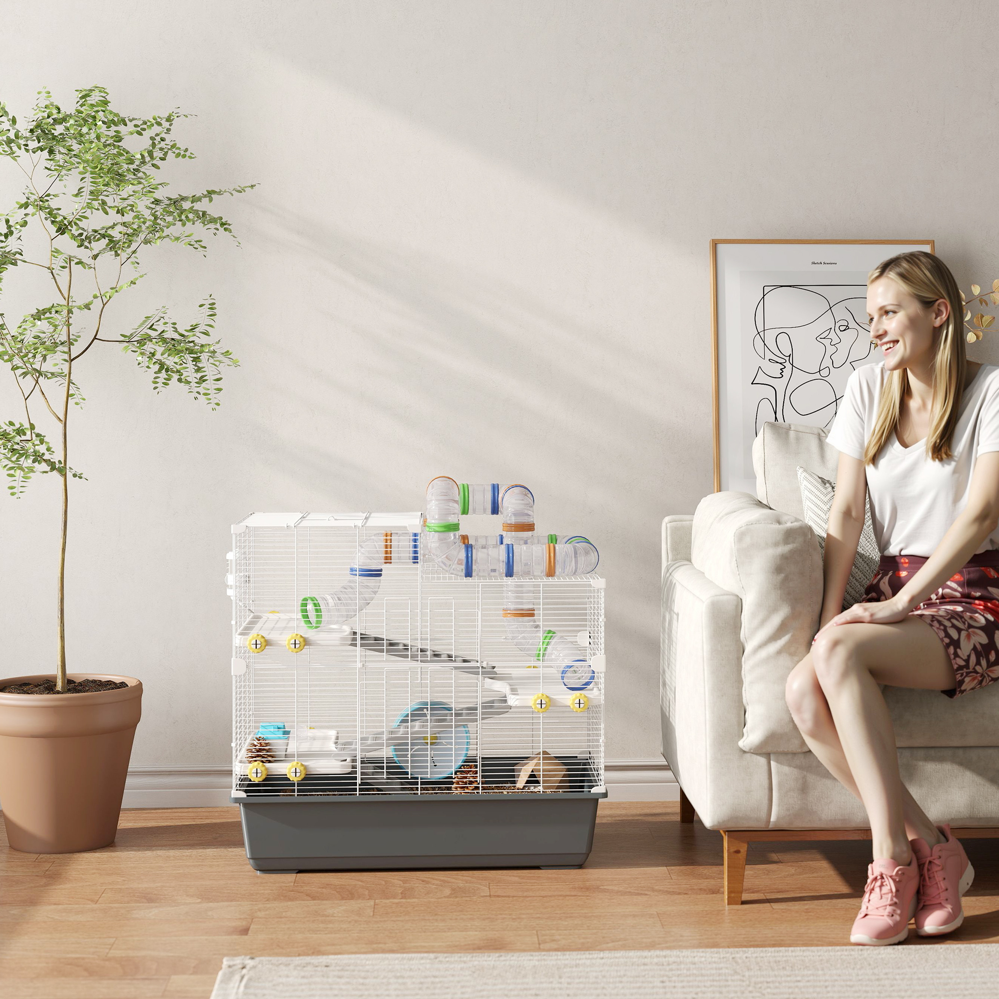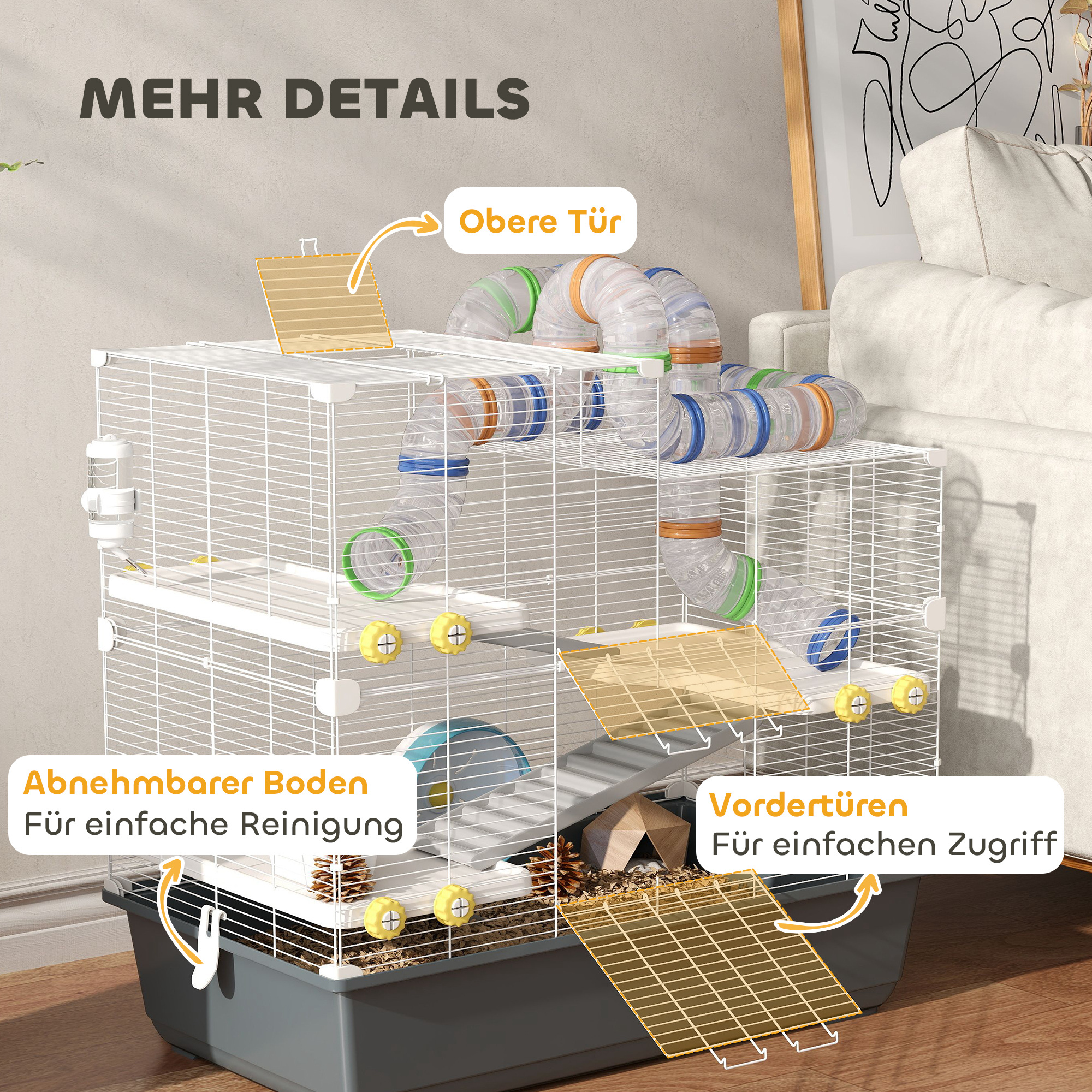 Entdecken Sie den PawHut Zwerghamsterkäfig! Der Kleintierkäfig bietet 4 Ebenen, ein buntes Röhrensystem zum Erkunden und reichlich Platz mit drei Stangen, Rampen und einer kuscheligen Hütte, Mit zwei Fronttüren und einer oberen Klappe leicht zugänglich, perfekter Hamster Käfig für kleine Nager, die die Abwechslung lieben,
